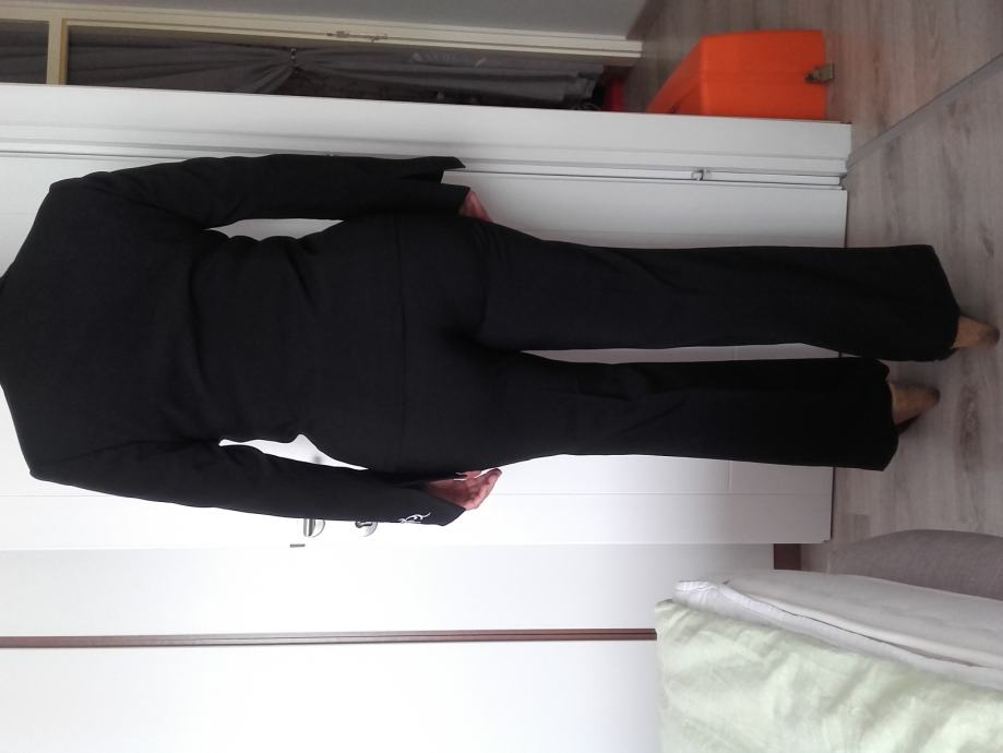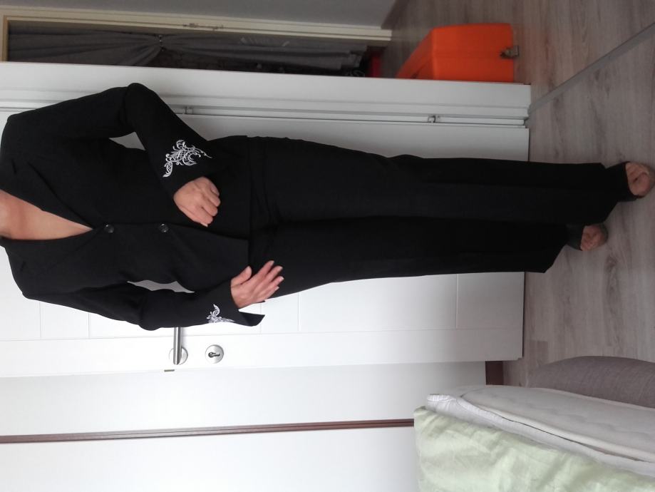 Crno žensko odijelo, veličine 38 sa zanimljivim detaljima na rukavima. Jednom nošeno, sako podstavljen, a materijal je poliester s malo elastina i lagano je.