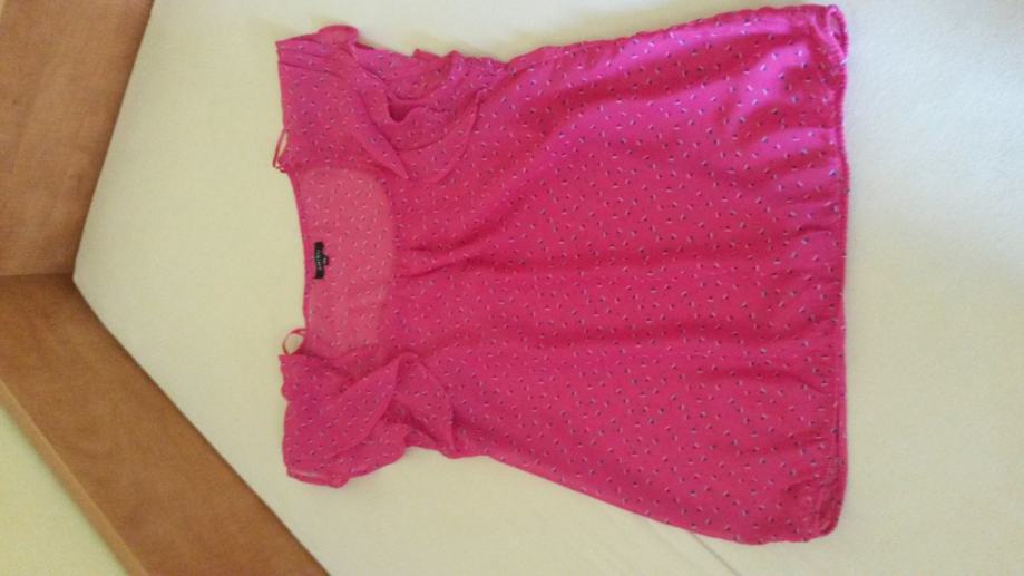 Prodajem novu ljetnu bluzu, veličine XL, sa kratkim rukavima na volane. Bluza je roza s diskretnim uzorkom i dolje ima gumicu.