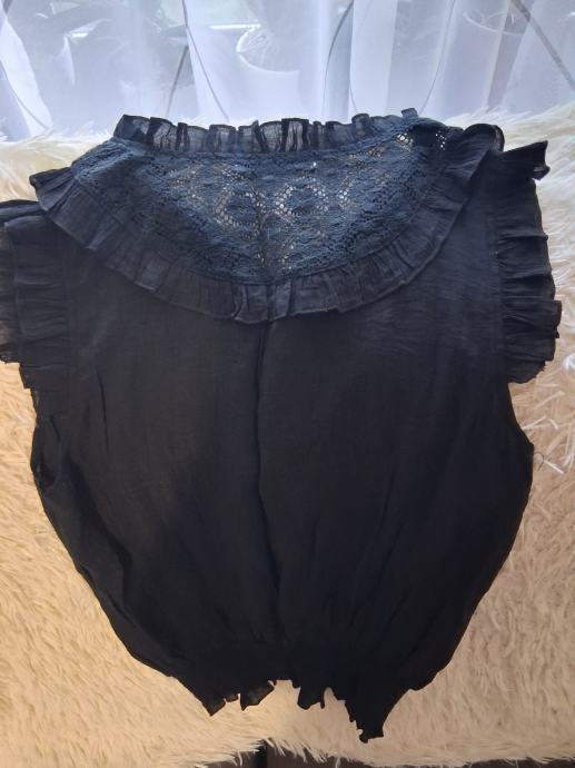 Crna odlična bluza 38-40.U odličnom stanju.Materijal je malo poput indijskog platna ,ali finiji,odlična kvaliteta.Gumica na kraju..Višak.