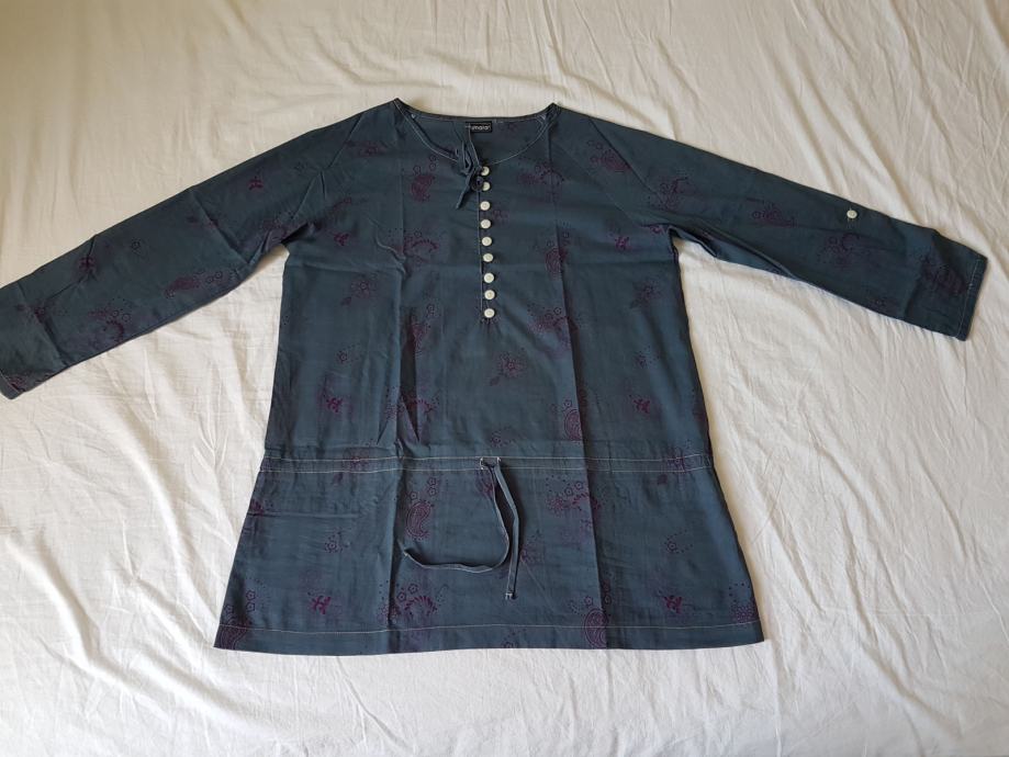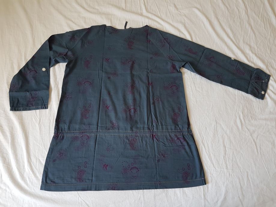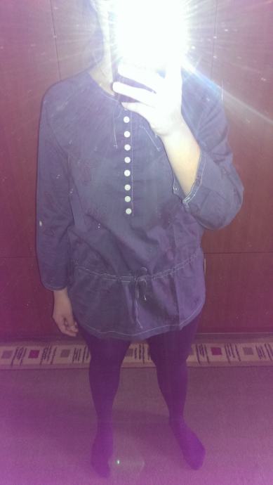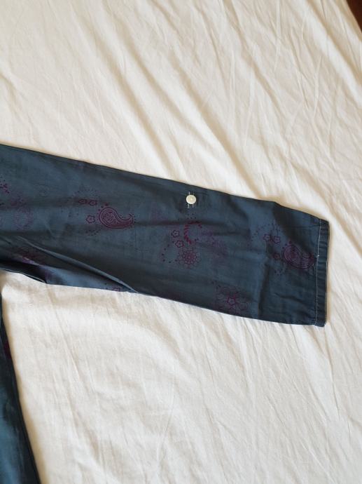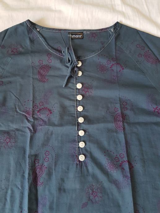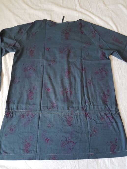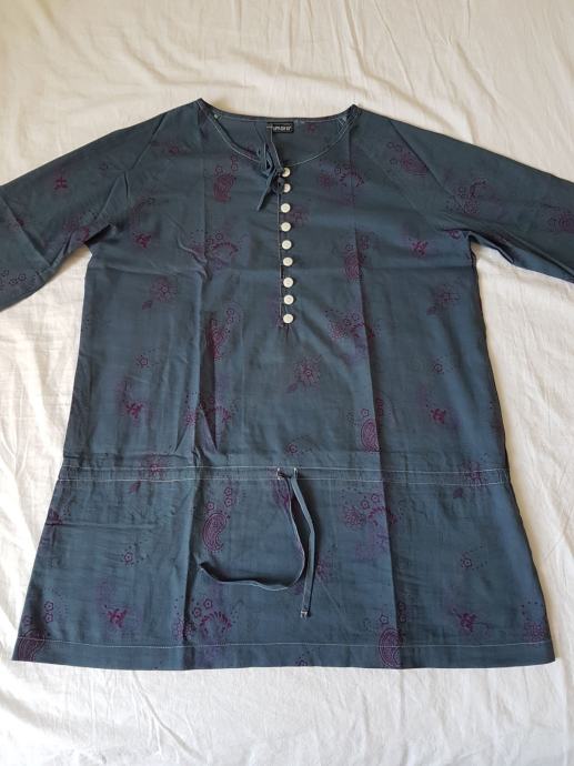Boho košulja plave boje, s ljubičastim detaljima. Oko bokova se sužava trakom pa je prilagodiva širini. Rukavi se mogu nositi kao 3/4 ili kratki. Lagana, pamučna, udobna za nositi. Nošena jako malo, očuvana, bez oštećenja. Veličina M / L, broj 40.