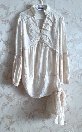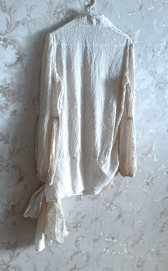 Svijetla bež, teksturirana bluza s širokom trakom na vezanje od istog materijala.