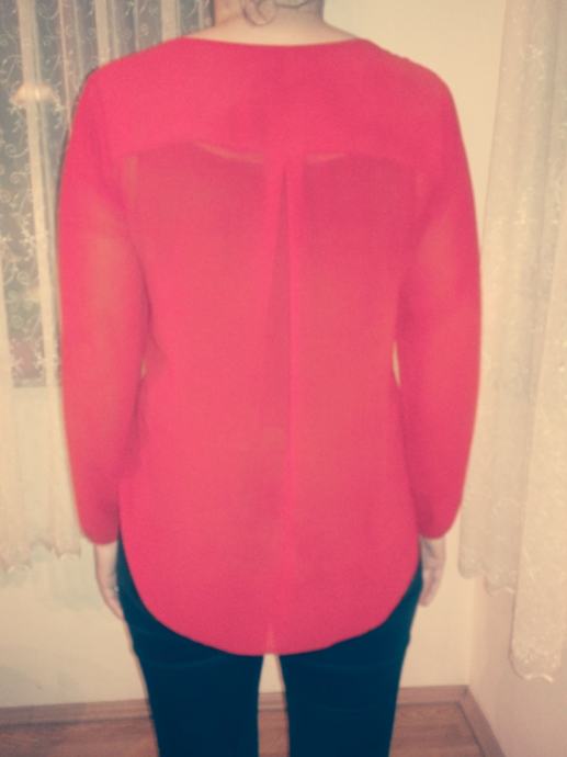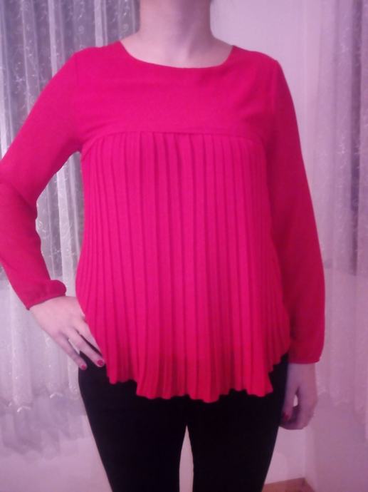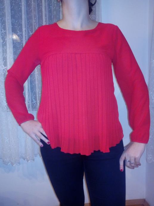 Crvena bluza veličina S/M, nosena 2 puta, kao nova, lagana, lijepo pada, naprijed su faltice, prava crvena boja, fotke nisu bas neke kvalitete, jako udobna, svečana. Malo se prozire materijal.