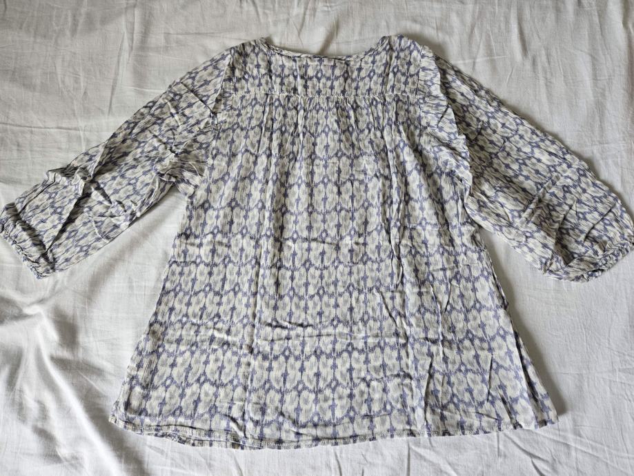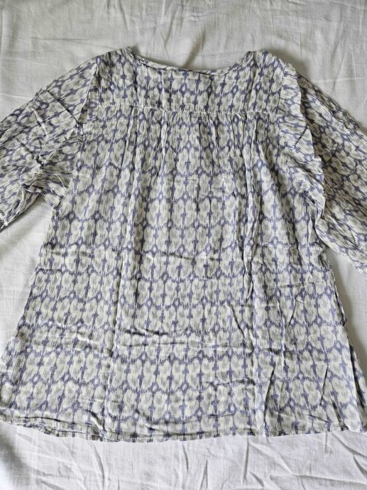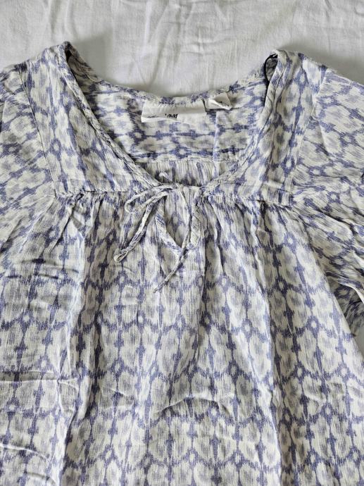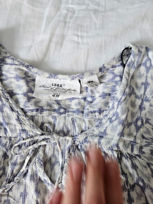 H&M bluza bijele boje sa plavim uzorkom. Lagana, pamučna, udobna. Rukavi su 3/4 dužine, ima vezicu ispod vrata te A kroj. Veličina 38, M. Nošena, ali očuvana.
