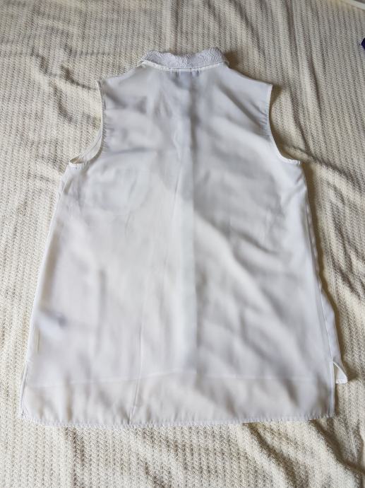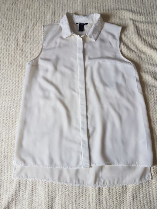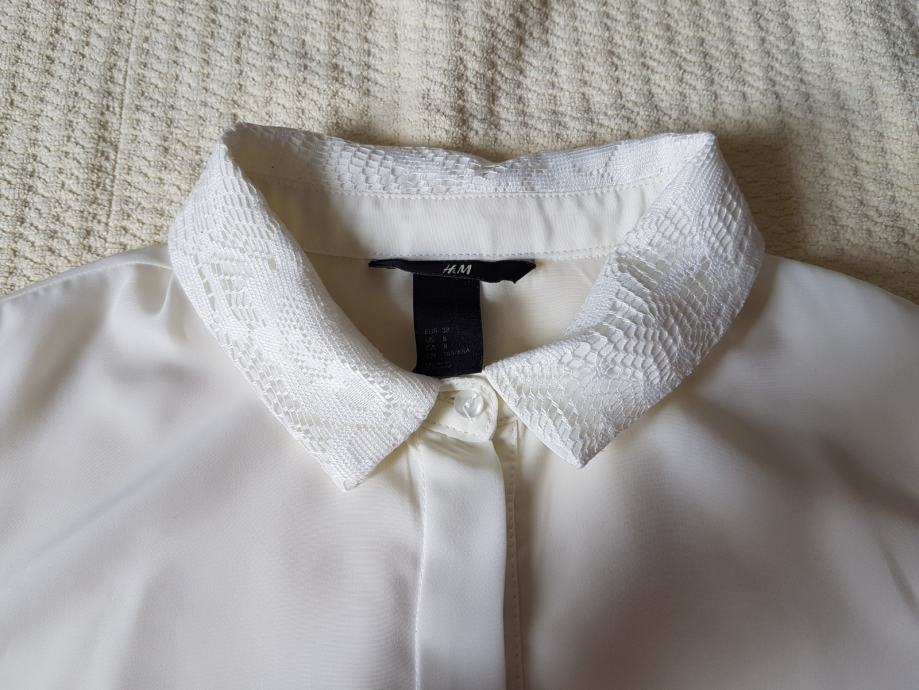 Košulja marke H&M, bijele boje, lagano prozirna. Ima zanimljivu čipkastu kragnu. Nošena malo, na 2 mjesta uz rub materijal se malo razvukao (vidljivo na slici broj 3) ali se to jedva primjeti, iz daljine se ni ne vidi, inače nigdje oštećena. Veličina M (38).
