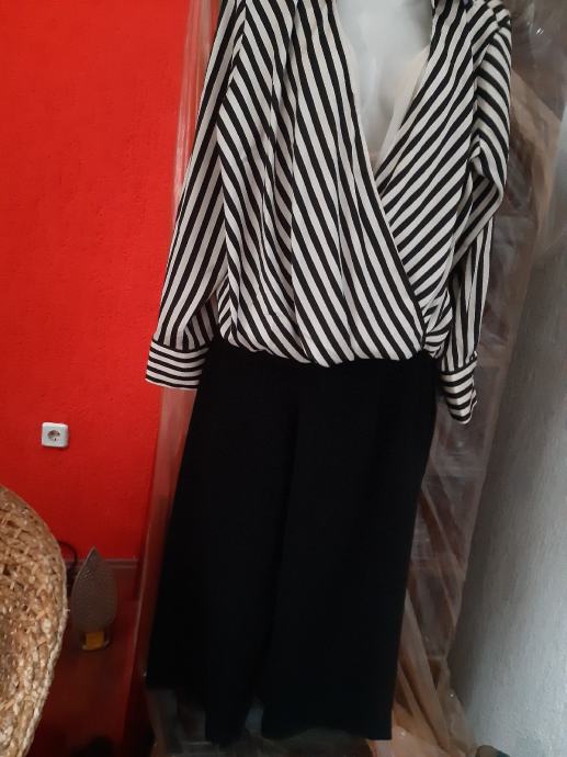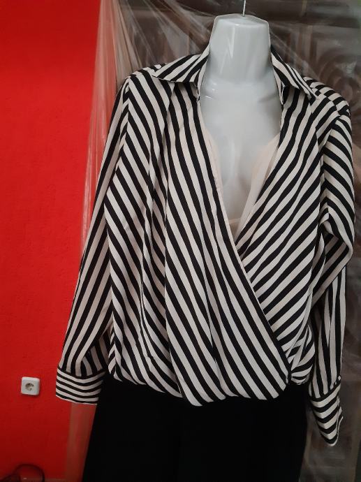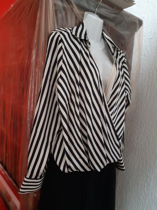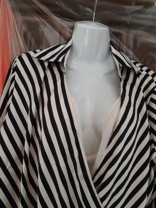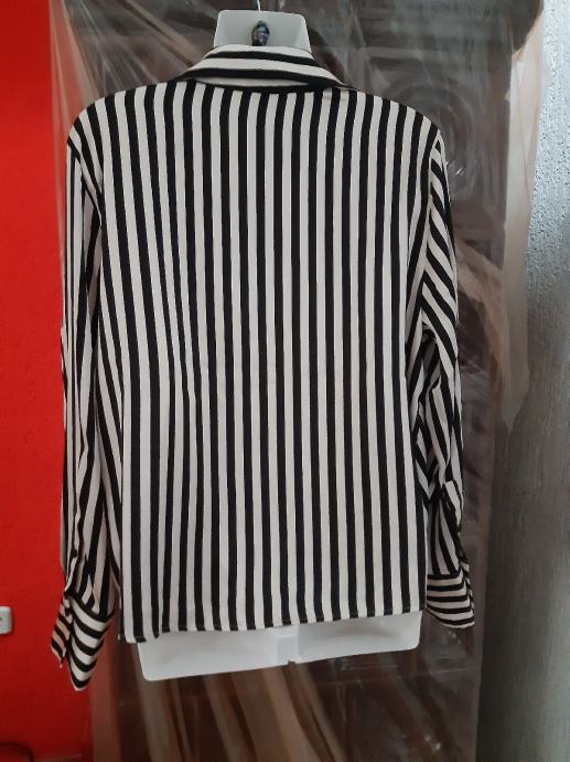 H & M prugasta crno- bijela kosulja na preklop, dugih rukava, vel. L. Širina prsa, prednja strana: 56 cm, duzina: 57 cm, rukav: 61 cm. Sastav: poliester.