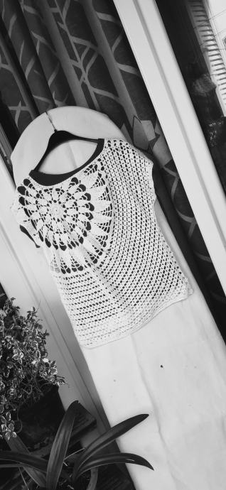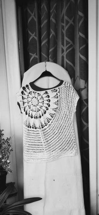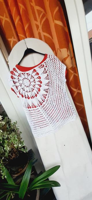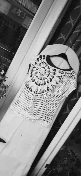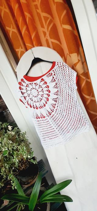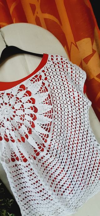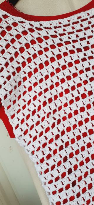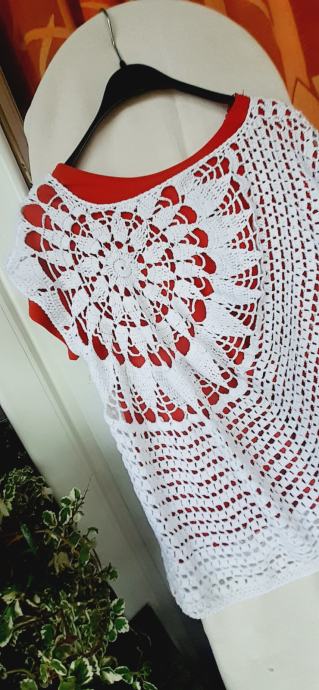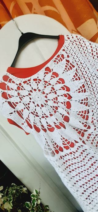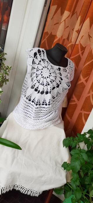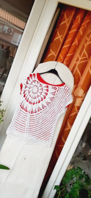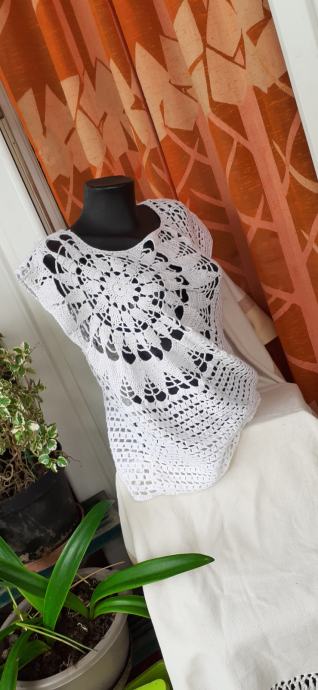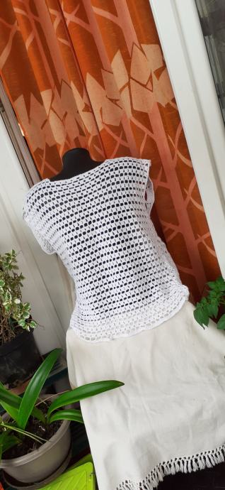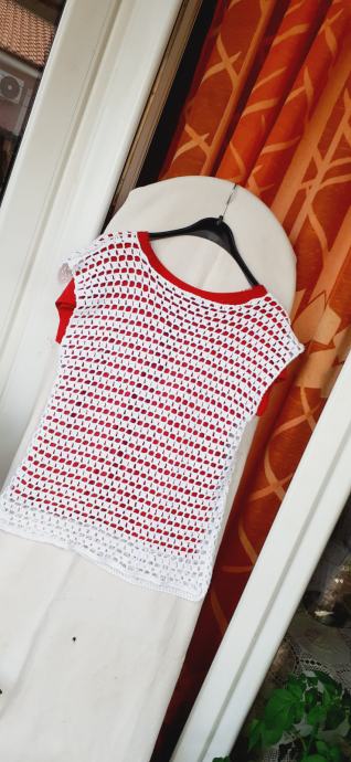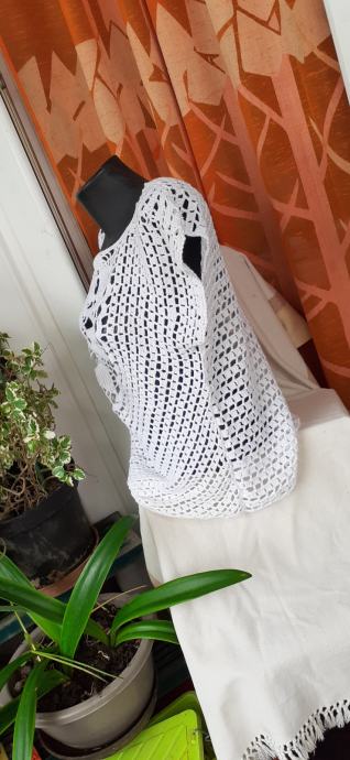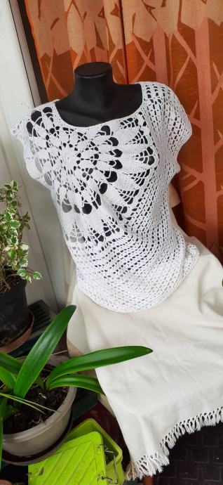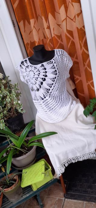 Nova ljetna bluza-tunika, osobne izrade, isheklana od pamučnog konca. Ima dva strukturirana uzorka, ugodna za nositi u toplim ljetnim danima. Širina ramena 55, pazuha 55, dužina od vratnog izreza iza 58, visina otvora za ruke 25 cm.