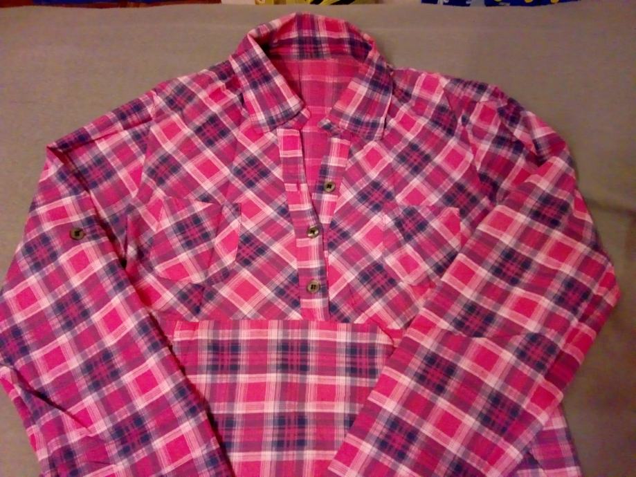 Povoljno prodajem kariranu roza košulju prelijepog kroja s vezanjem na leđima tako da može bolje istaknuti struk, a rukavi mogu biti dugi ili kraći što se može vidjeti na slikama.
