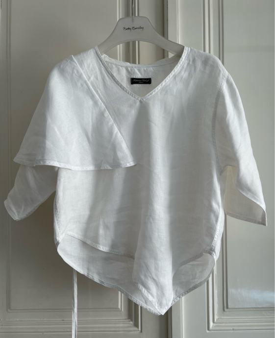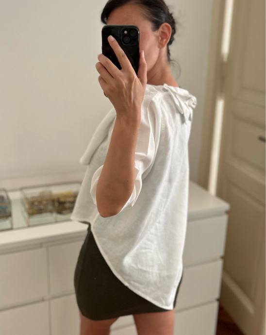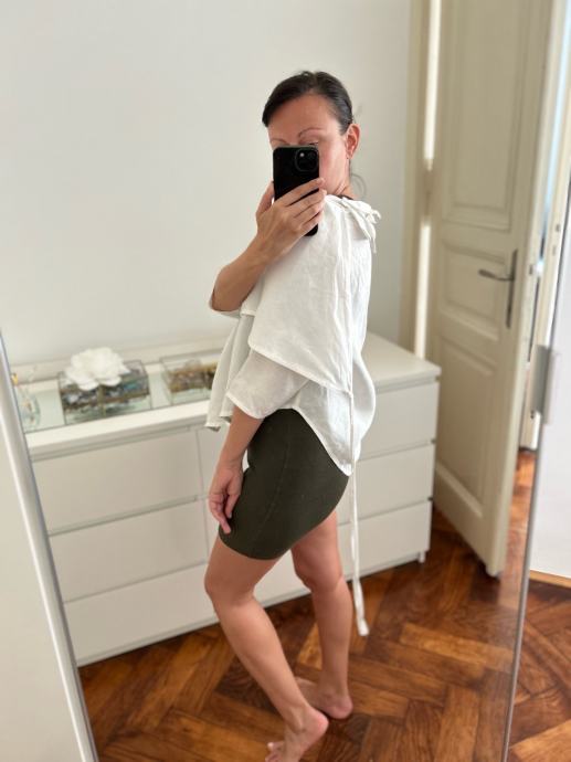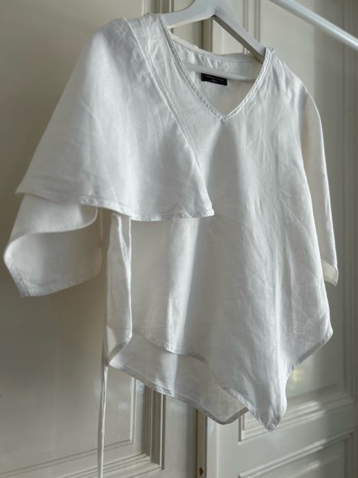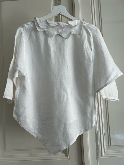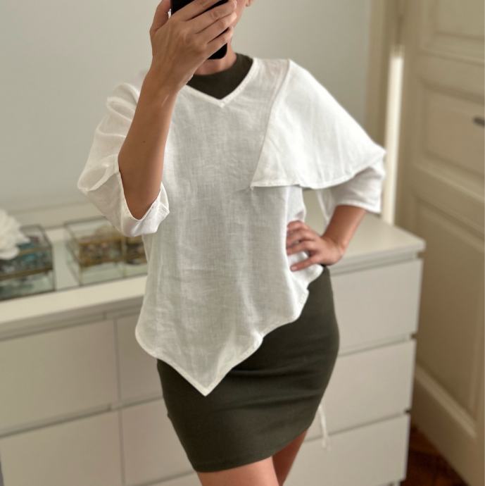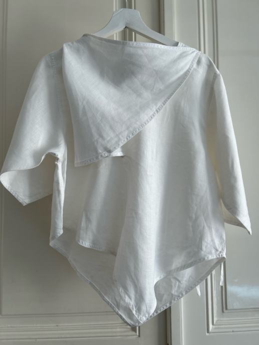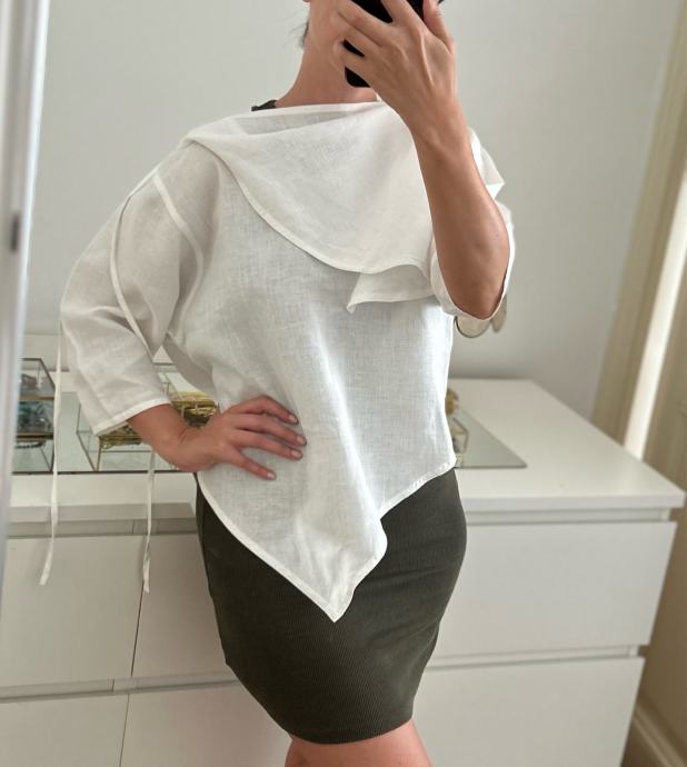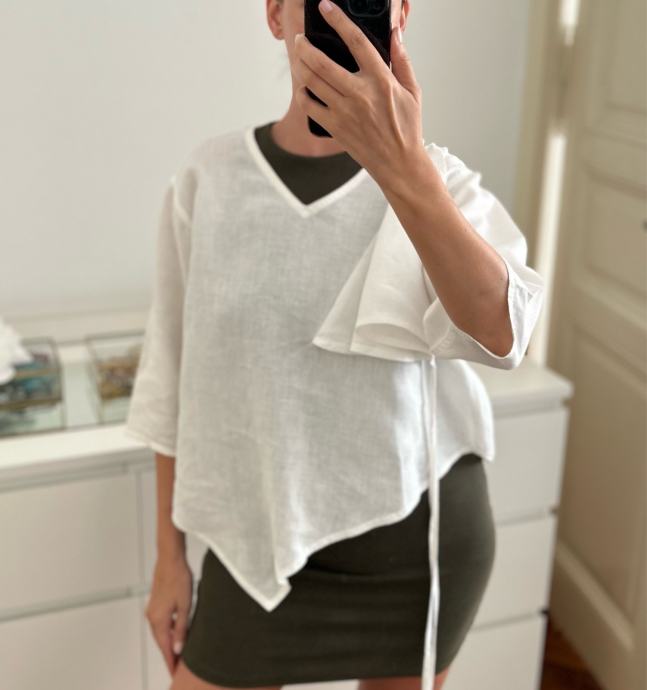 Ova lanena divota je nosiva na vise nacina i odgovara vise velicina. Opseg grudi je 110 cm - jedina relevantna mjera. Kety ne stavlja ušivne etikete ali sve sam vam napisala :)