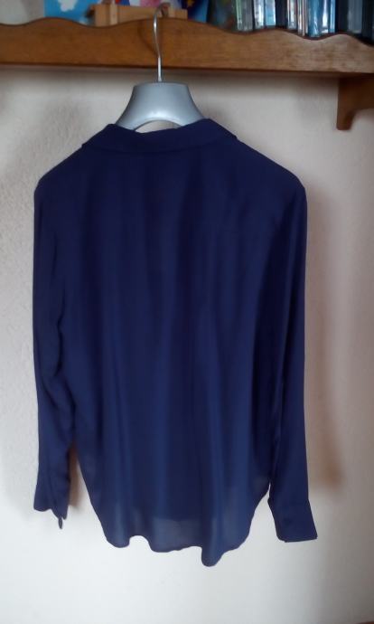 plava, lagana, lepršava košulja, kopčanje nije od vrata nego dekoltea,