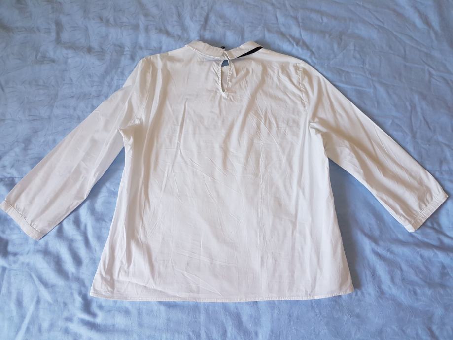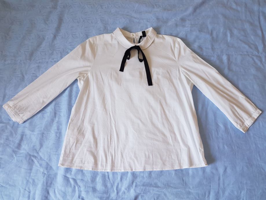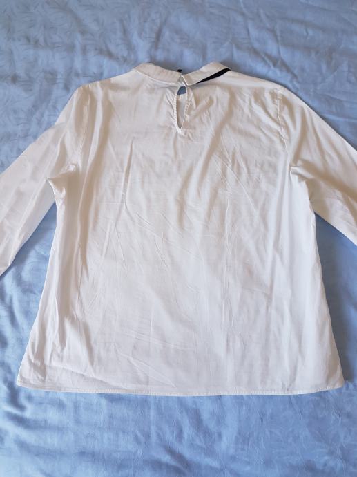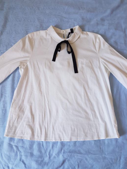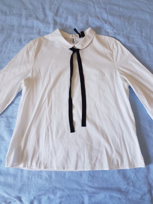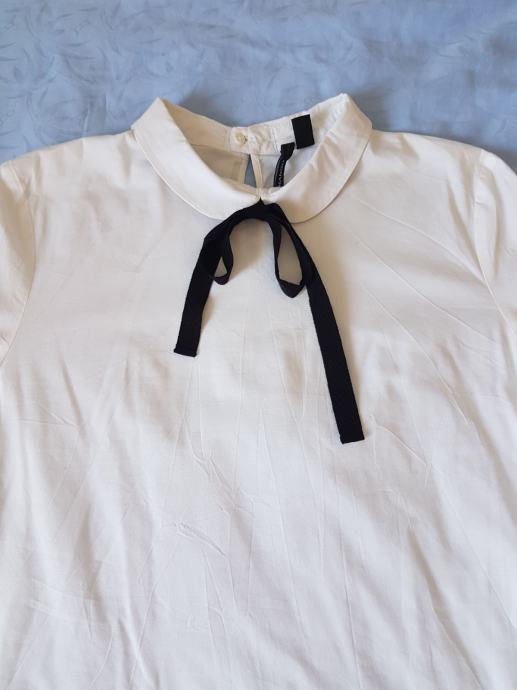 Prekrasna pamučna bluza marke Mango, rukavi su 3/4 dužine. Lagana, udobna za nositi. Ima malu kragnu ispod koje se veže traka crne boje, može se vezati na više načina (prikazano na slikama). Košulja je nošena par puta, kao nova. Veličina M (38).