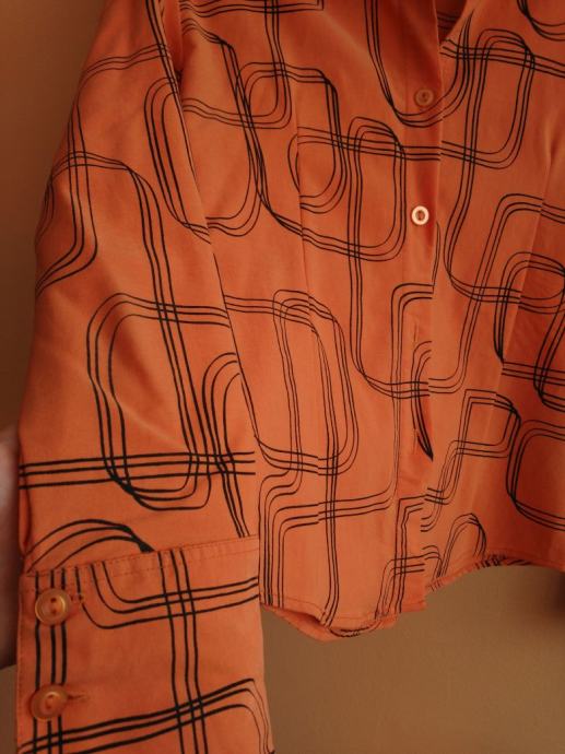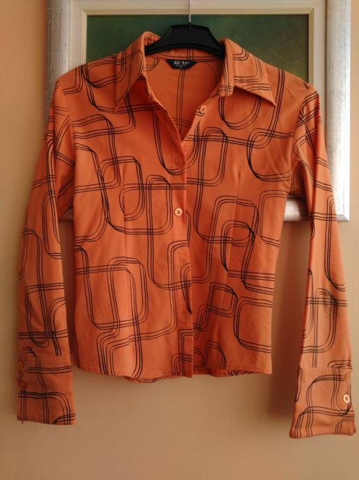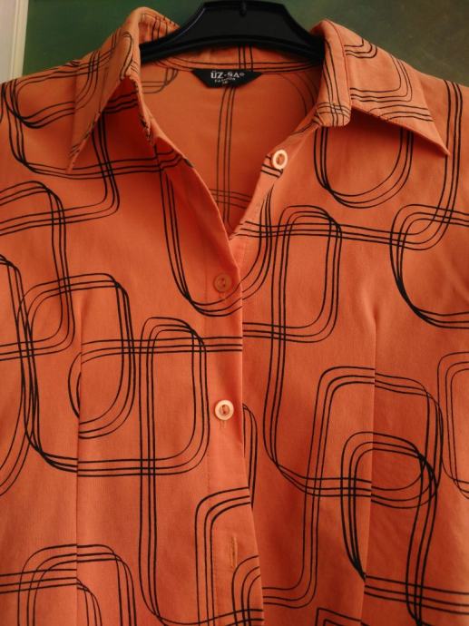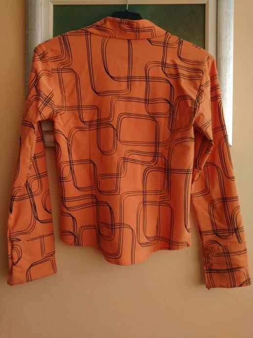 Pomalo otkačena i neobična ženska košulja vel 36 / 38, narančasta sa crnim detaljima, jako lijepo stoji, može se nositi na posao / fax / za svaki dan, širina cca 41cm, dužina cca 55-56cm.