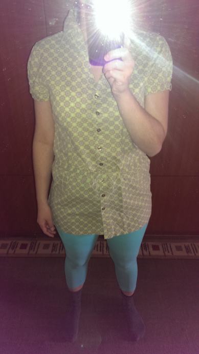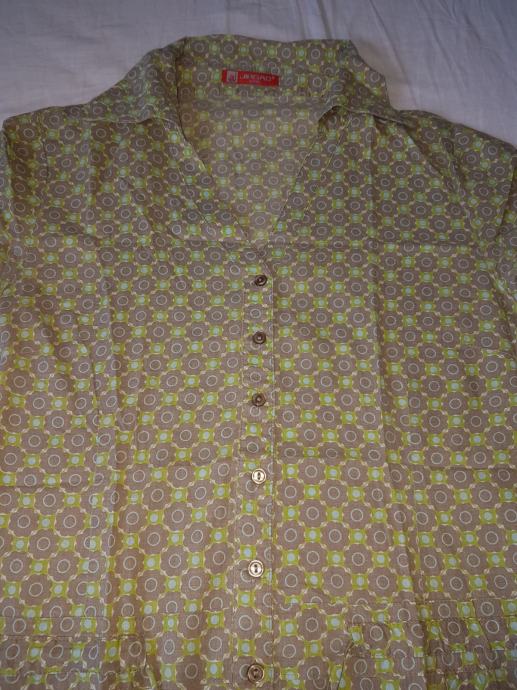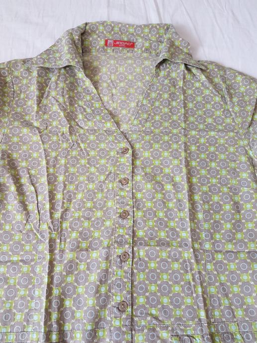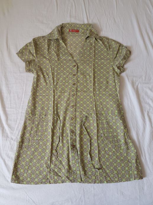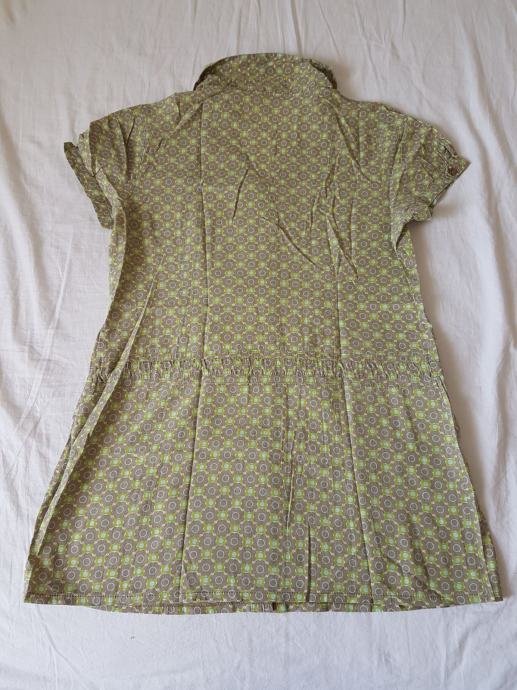 Pamučna tunika, u zelenim, smeđim i plavim tonovima, sa cvjetnim uzorkom. Nošena jako malo, u odličnom stanju. U bokovima se prilagođava širini jer ima traku. Veličina M / L, broj 40. Slikana bez i s blicem.