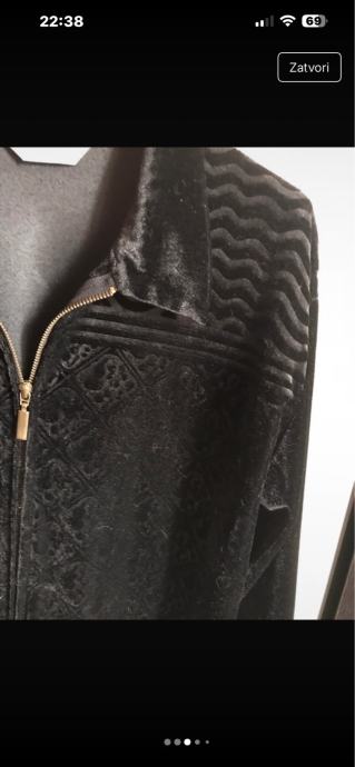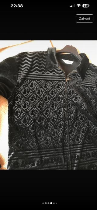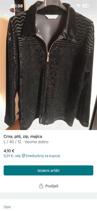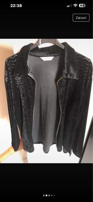 Prodajem žensku pliš bluzu/jaknicu marke Cricket u veličini 40 (XL prema oznaci na etiketi). Komad je crne boje, dugih rukava, od mekanog pliš materijala koji je ugodan za nošenje. Jaknica ima zip zatvarač i teksturirani uzorak na prednjim dijelovima, što joj daje zanimljiv izgled.