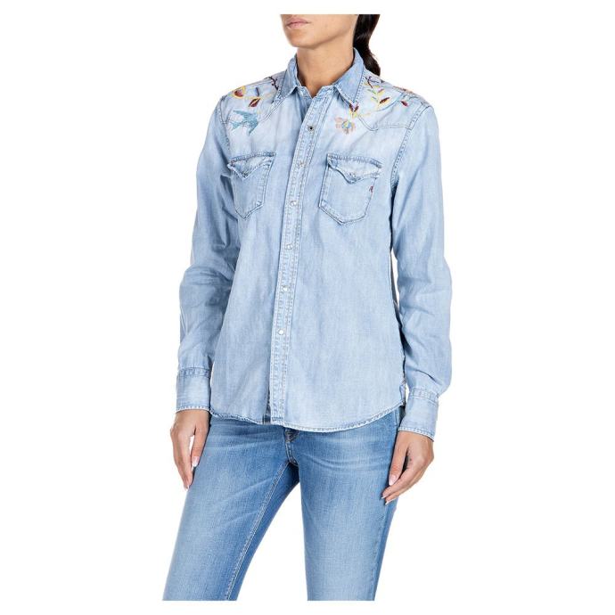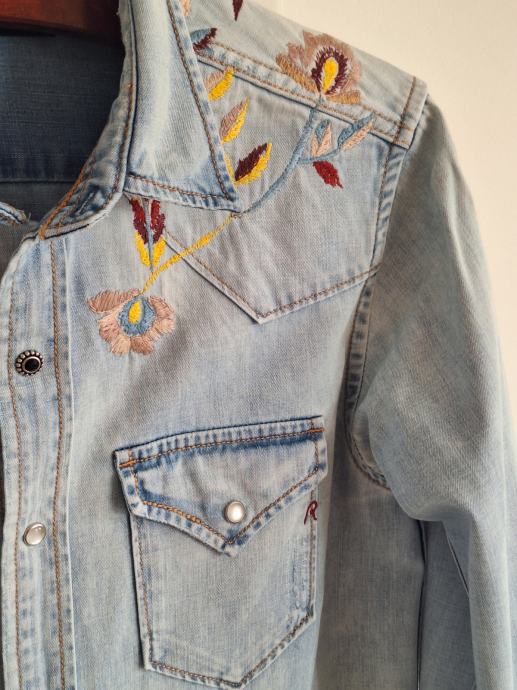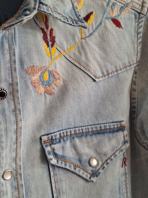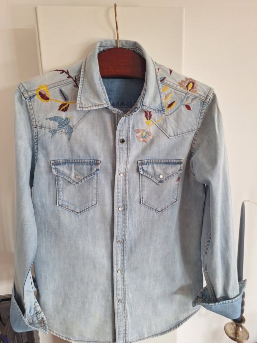 Replay ima svoje iconic traper/jeans košulje sa šiljastim džepovima, drukerima koji su lijepe sedefaste boje.