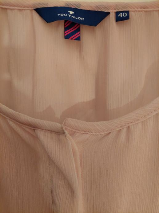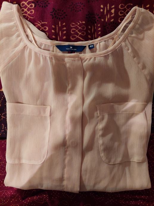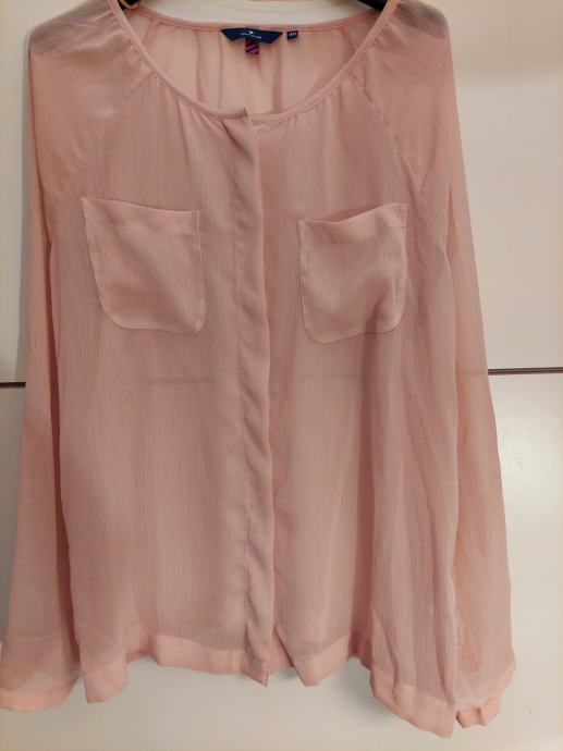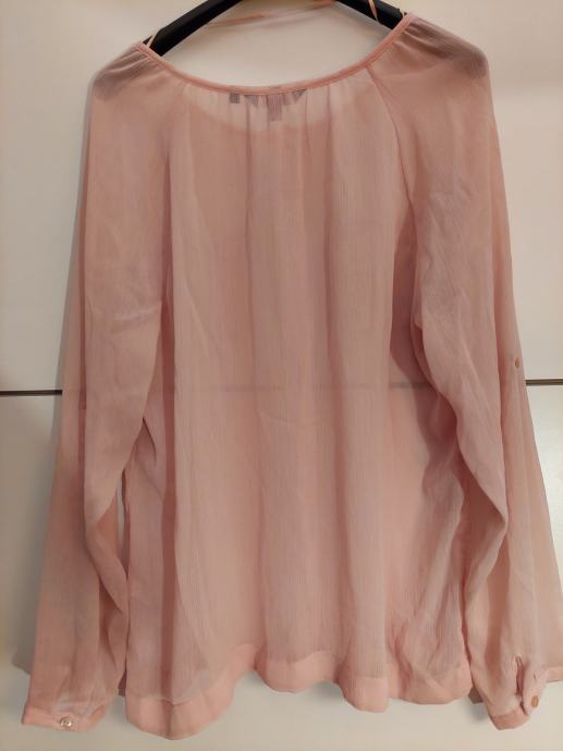 Tanka nova (bez etikete) bluzica, nježno roza boje, sedefasti mali gumbići za kopčanje naprijed. Na grudima sa svake strane mali džepić, oko vrata tanka pasica, rukavi dugački s tankim manšetama i gumbićima. Vrlo ugodna i savršeno pada uz tijelo.