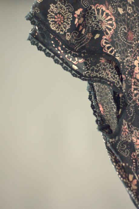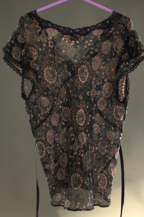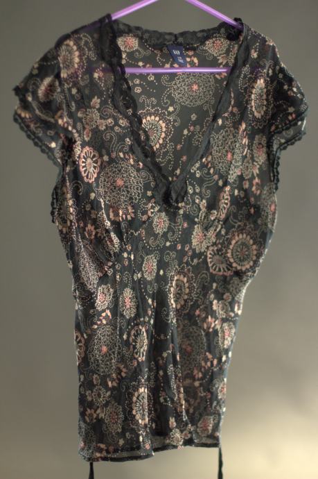 Atraktivna Gap svilena bluza crne boje s cvjetnim uzorkom i obrubom od čipke, prozirna. Veličina na etiketi L ali je više S eventualno manji M. Očuvana