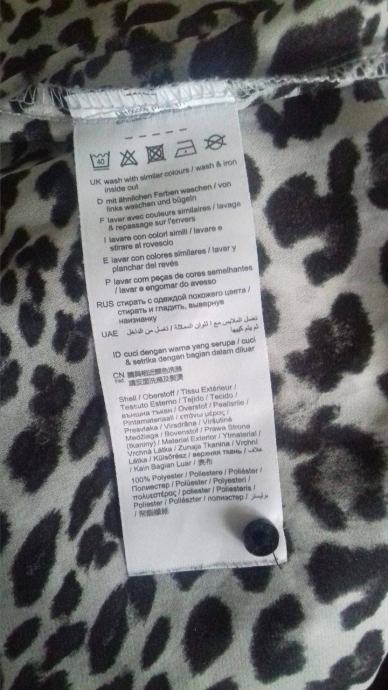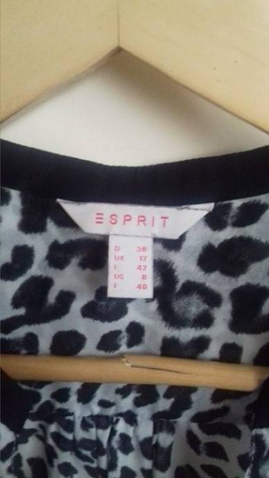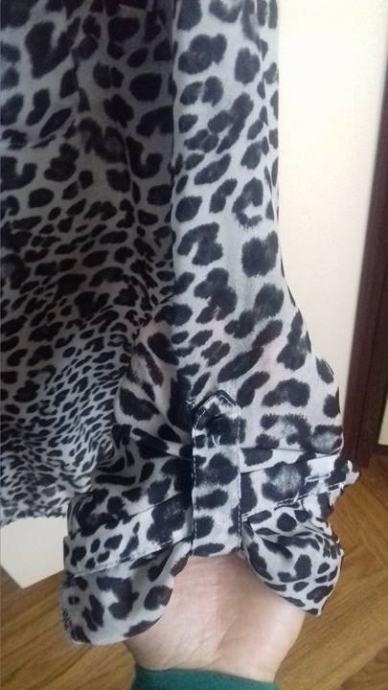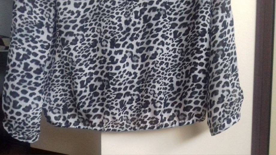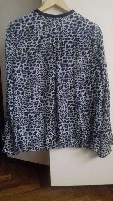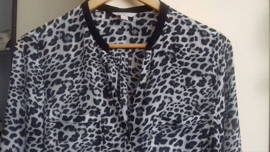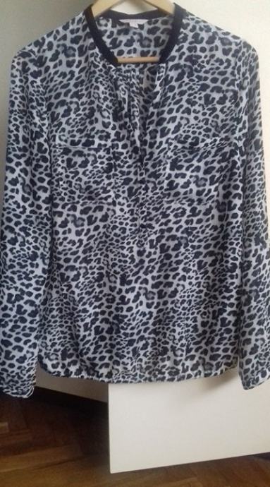 Tigrasta košulja, veličina M, marka Esprit, boje kao na fotografijama, crna-bijela, nova, nosena mozda jednom, svilena, V izrez, super stoji. Rukavi se mogu podvrnuti i zakopčati. Naprijed ima 2 dzepica.