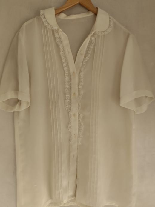 Romantična žutkasto-bež bluzica s čipkom, ramena 38cm, dužina 66cm.