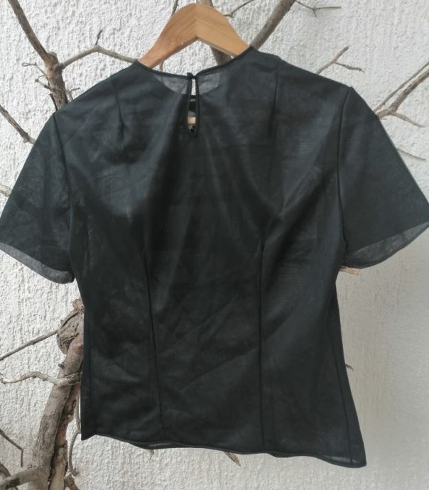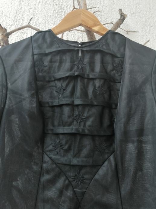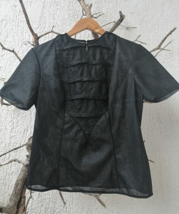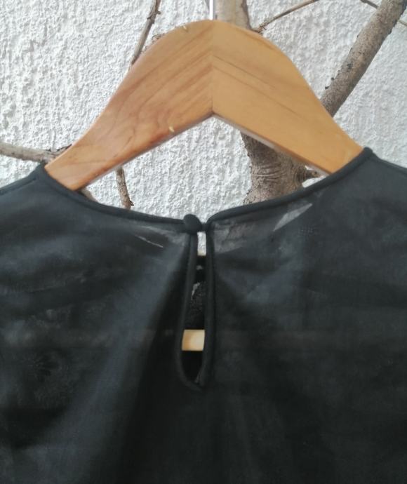 Prekrasna crna bluza s ušivenim cvjetovima na dekolteu.