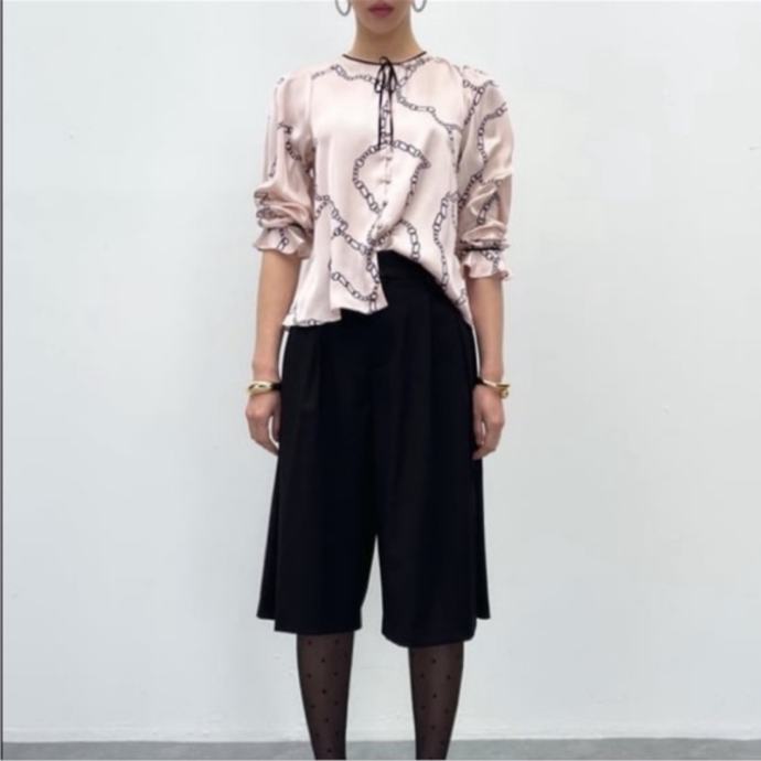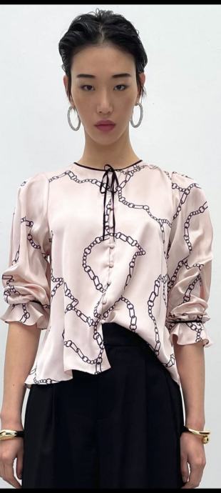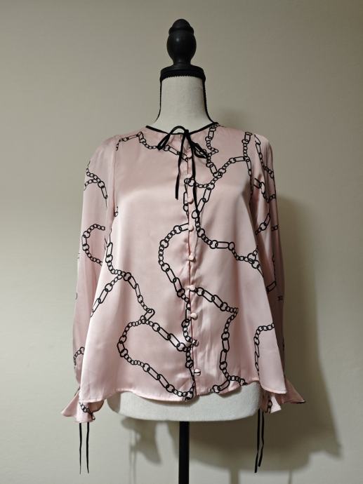 Prodajem potpuno novu Zara satensku bluzu s etiketom, veličine 36, u elegantnoj svjetloružičastoj boji s uzorkom lanaca. Bluza ima lijepe detalje poput vezica na ovratniku i naboranih rukava. Materijal je izuzetno mekan i luksuznog izgleda, idealan za svečanije prilike.