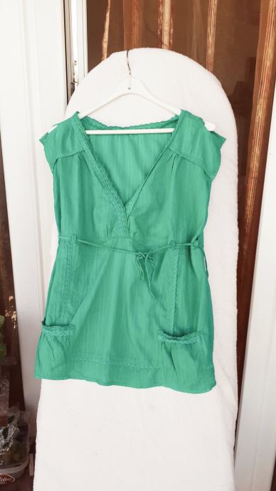Kao nova, tanka, ljetna, ukrašena čipkom, rezana ispod grudi, od pamučnog materijala, mekana, lagana, ugodna. Na ramenu je manji rukavni izrez, dužine 28 cm, ima dva mali džepiće pri rubu i trakicu za reguliranje širine u struku, postojane trava-zelene boje. Malo je krojena uz tijelo, prava ljetna, lagana kao pero. Boja je vjerna, slikano na danjem svjetlu. Širina od pazuha do pazuha 55, dužina od vratnog izreza iza do ruba po sredini 62 cm.