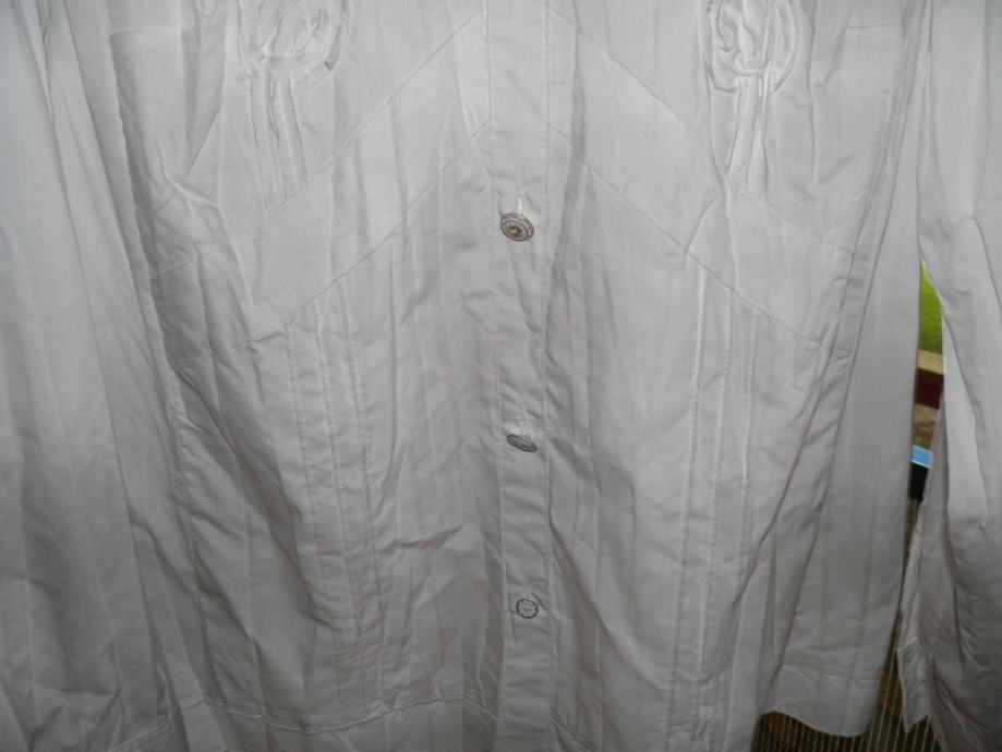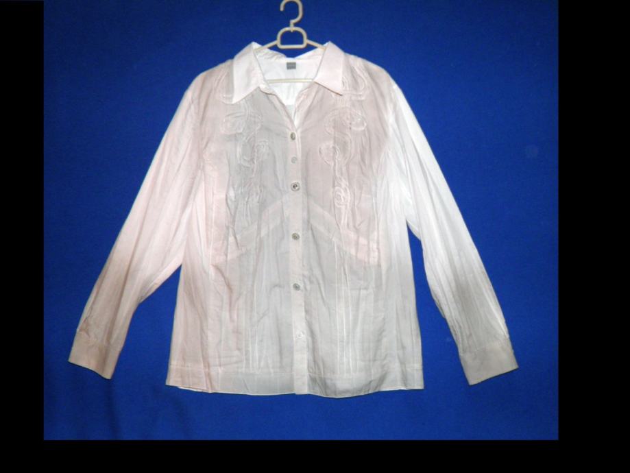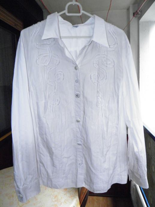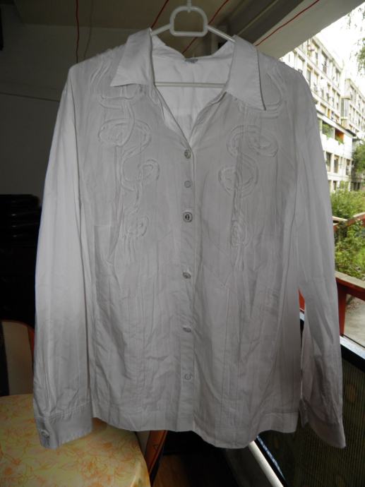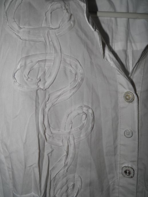 Nošena par puta, bez tragova nošenja. Sada je prevelika. Vel.46. Vrlo lagana i ugodna košulja sa uvijek zanimljivim Erfo dizajnom. Gumbi su namjerno različiti i postoji još 1 rezervni unutar kožulje. Bijele je boje sa sivim tonovima pri dnu košulje i pri kraju rukava. 80% poliester, 20% pamuk. Prsa 56 cm, dužina 71 cm, rukavi 61,5 cm