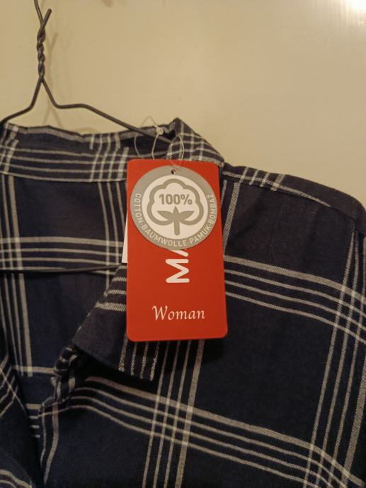 Nova ženskq košulja s etiketom, veličine 46. Radi se o dužoj košulji s dugim rukavima, crne plave boje s bijelim kariranim uzorkom. Ima klasični ovratnik i opušteni kroj. Izrađena je od 100% pamuka.