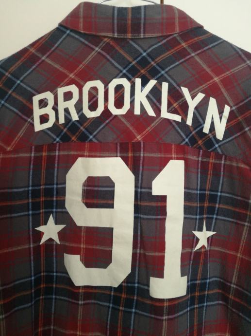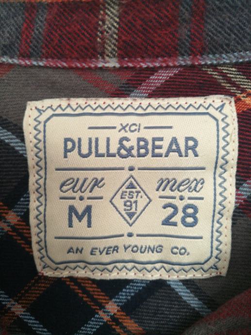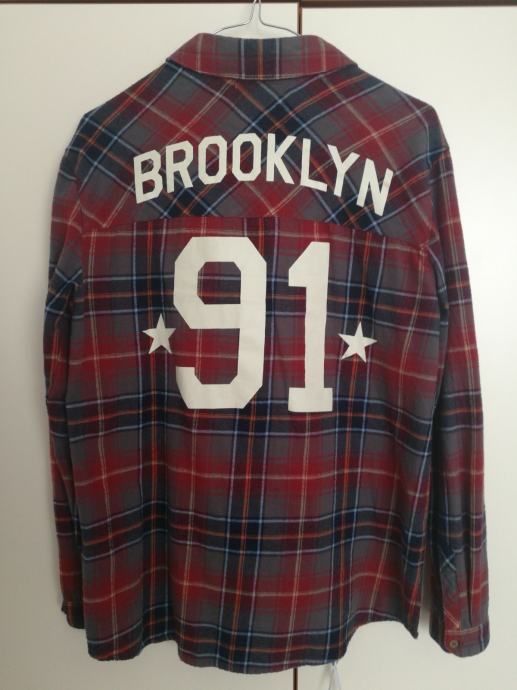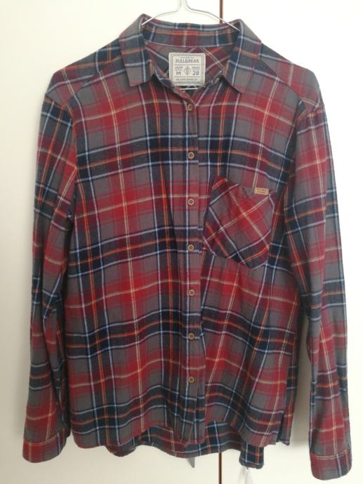 Karirana košulja s natpisom na leđima, normalne duljine, kupljena u Pull&Bearu, veličina M, ali paše i S veličinama.