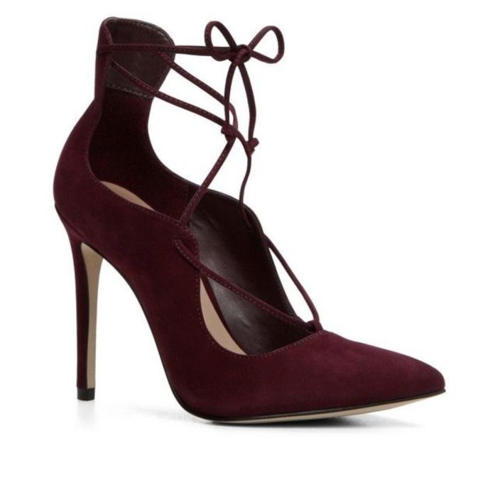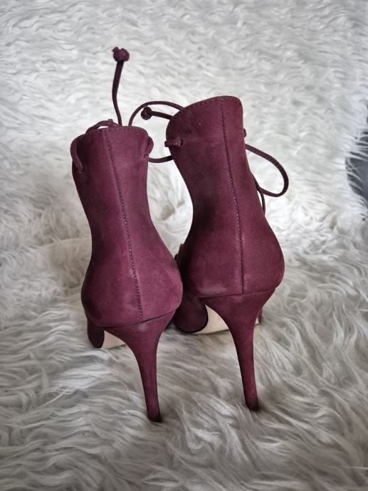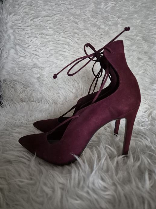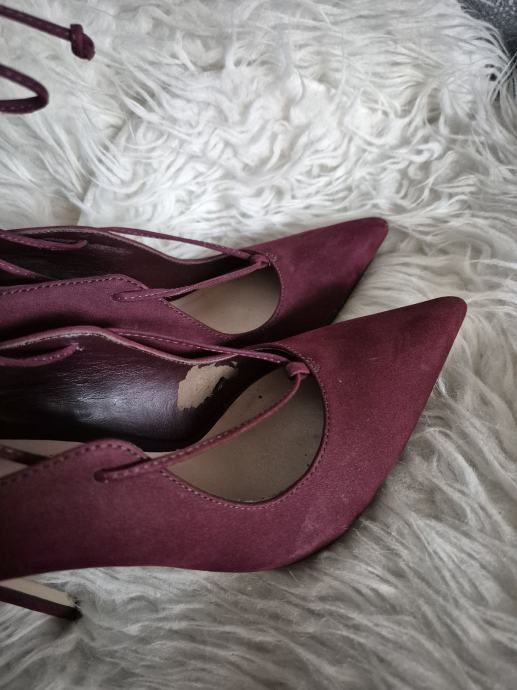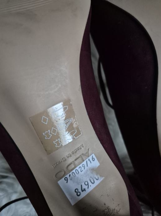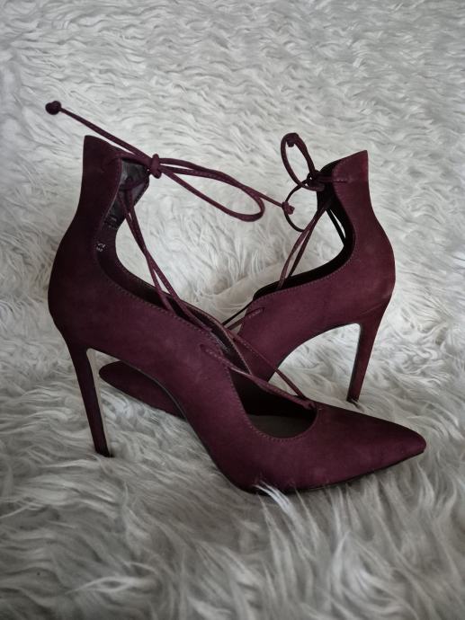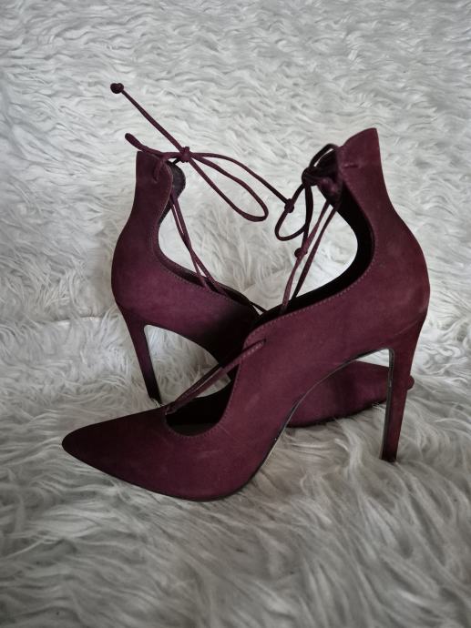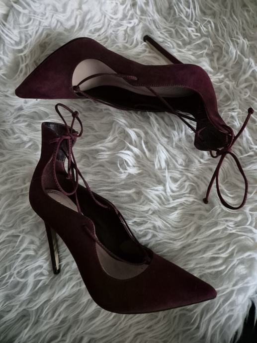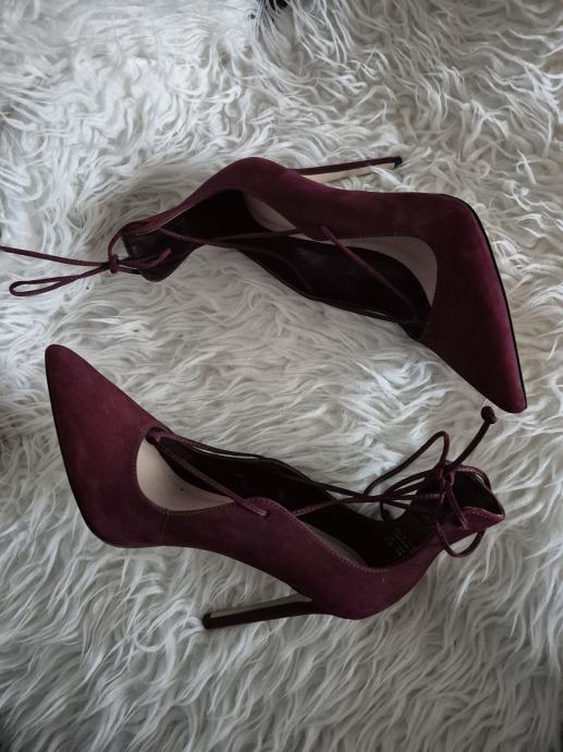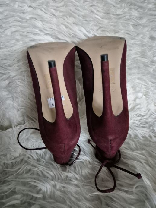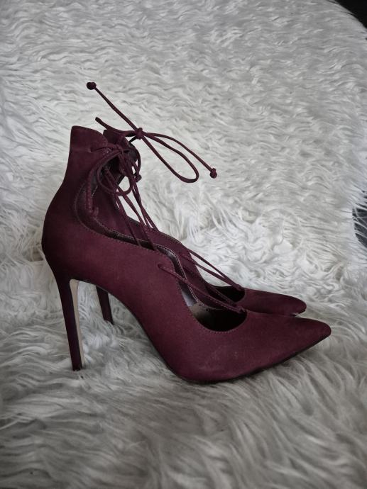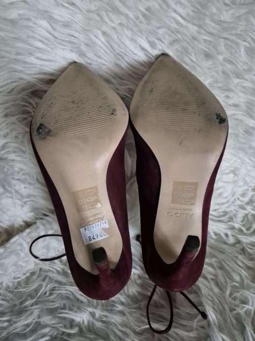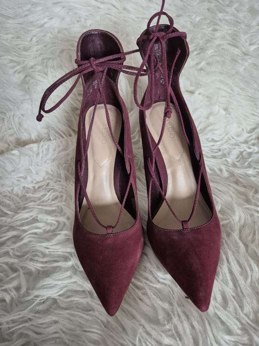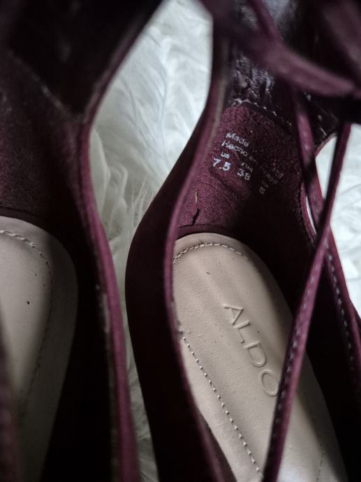 Prodajem elegantne Aldo cipele veličine 38 s visokom petom od 11 cm u bordo boji. Cipele su malo nošene i u odličnom stanju, s atraktivnim vezicama koje se križaju oko gležnja.