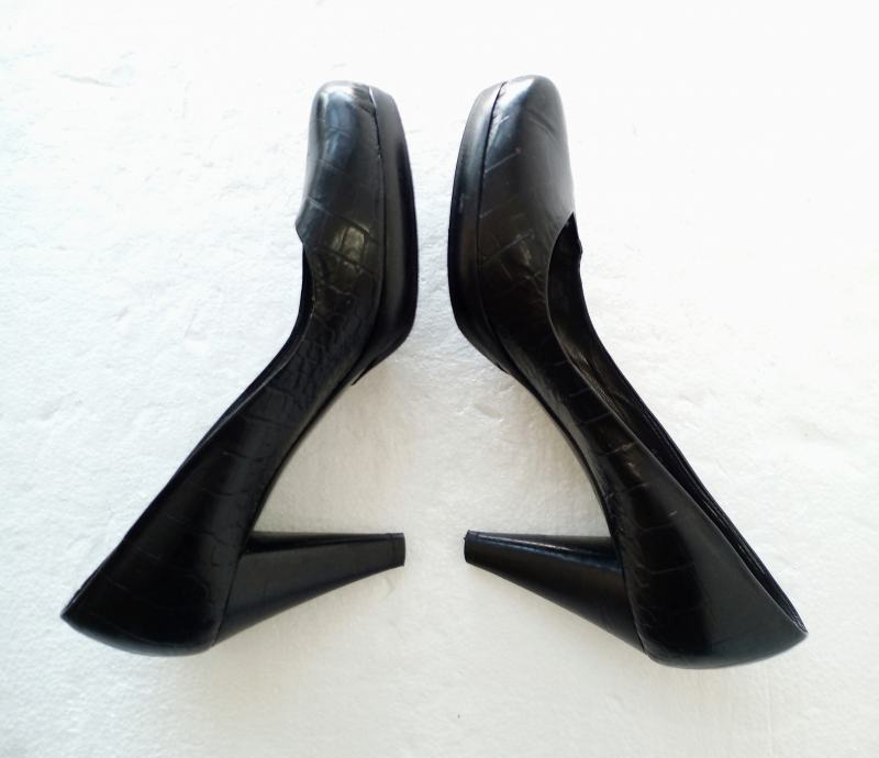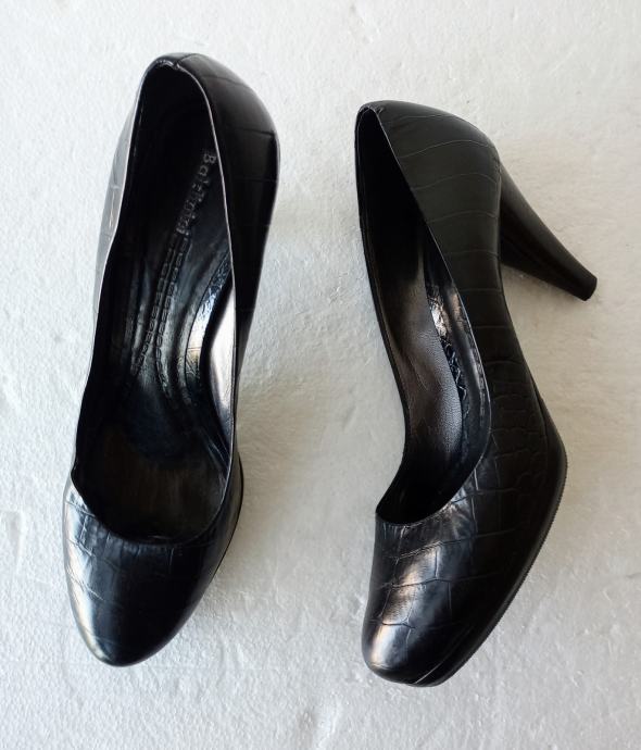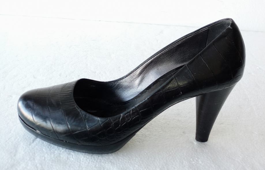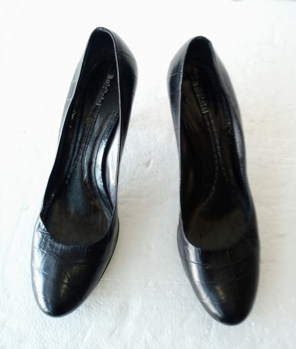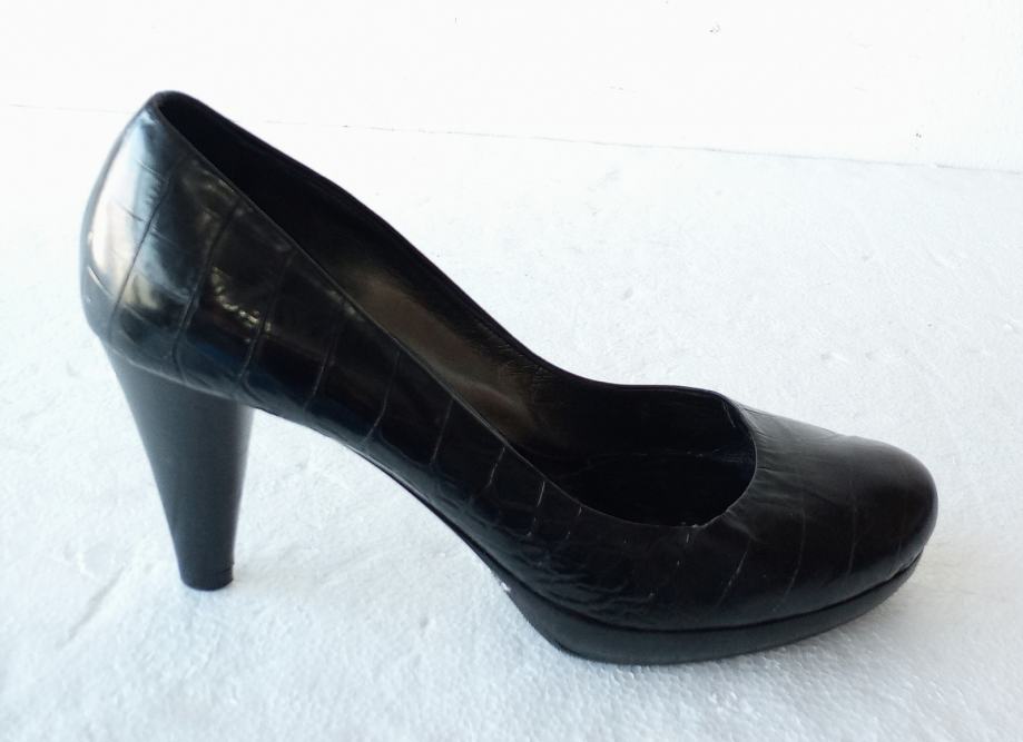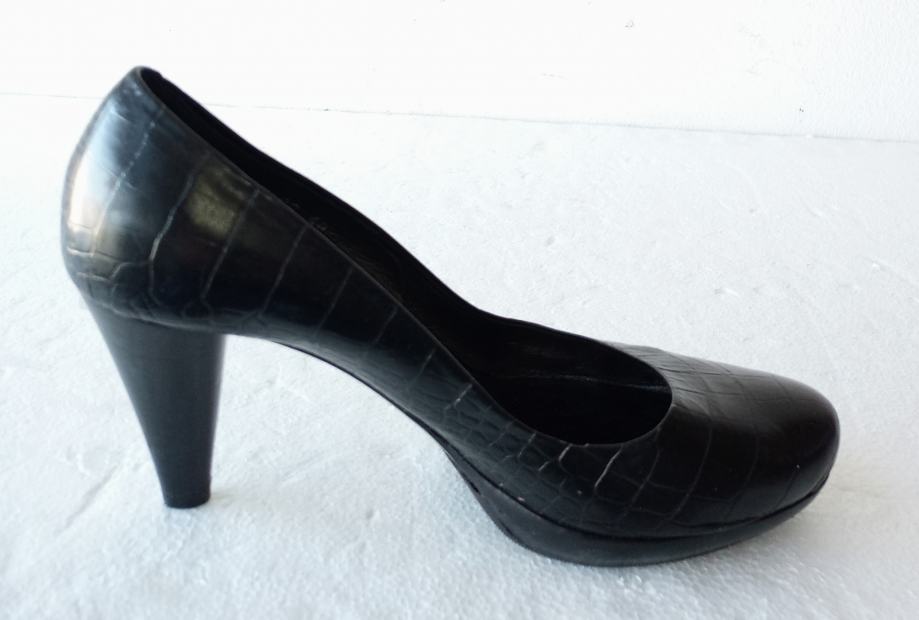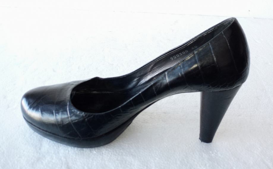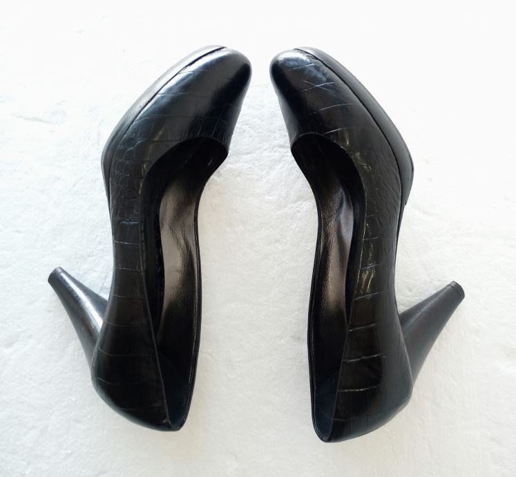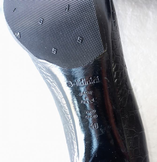 Baldinini crne salonke u kroko dezenu. Veličina 40 (gazište 26,5 cm). Izvana, iznutra i džonovi - sve od prirodne kože. Kod postolara dodan protuklizni prednji dio džona. Peta stabilna, visine 9 cm. Klasično elegantne, svevremenski model! Nošene kraće vrijeme, u super stanju. Vrlo skup brend.