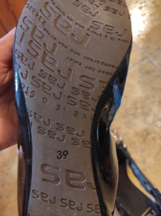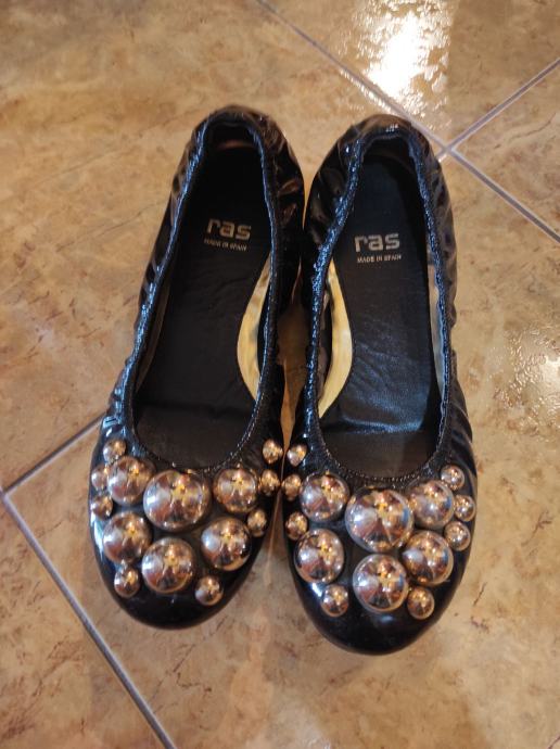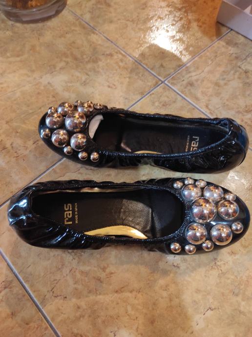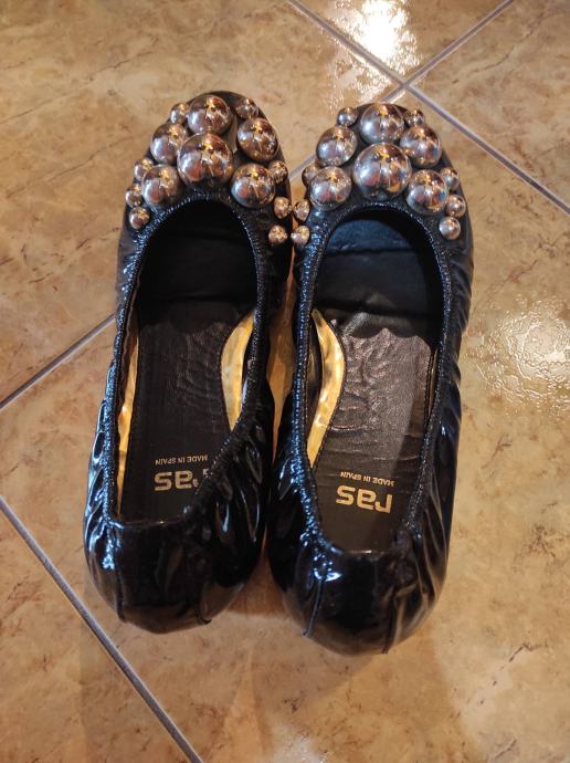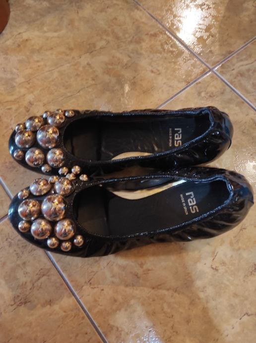 BALERINKE CRNE KOŽNE LAKIRANE br. 39, u dobrom stanju, sa zlatnim ukrasima s prednje strane, s unutarnjom petom, malo manjeg kalupa.
