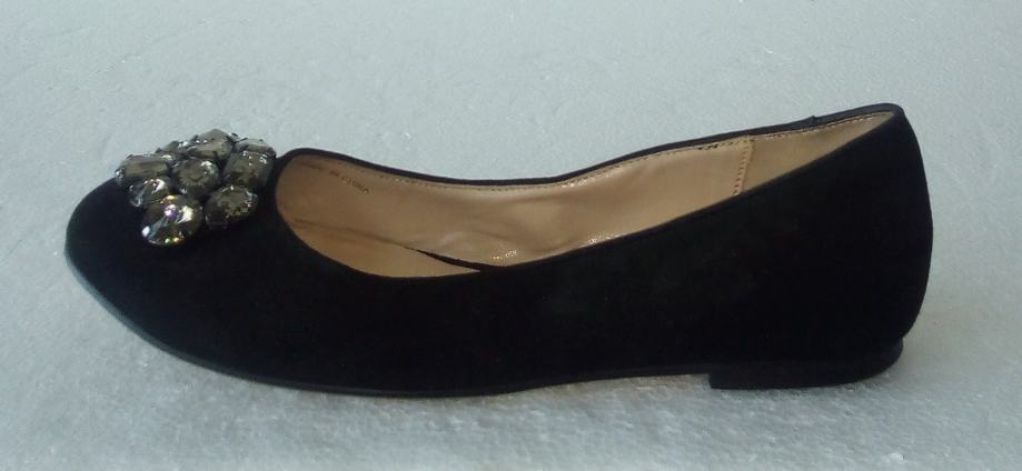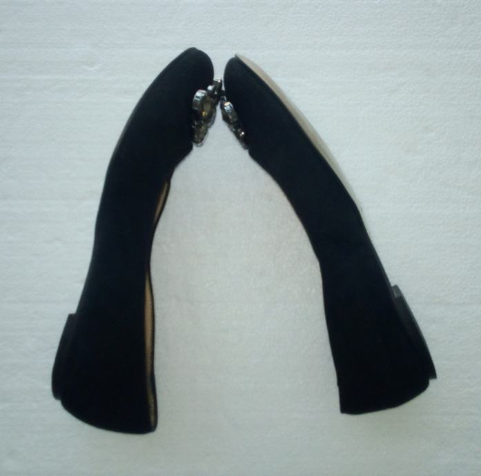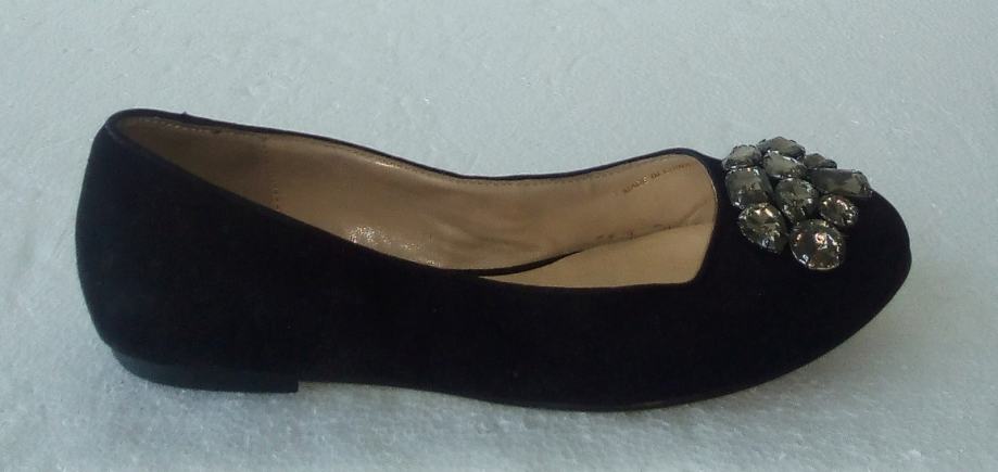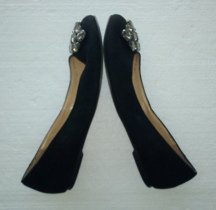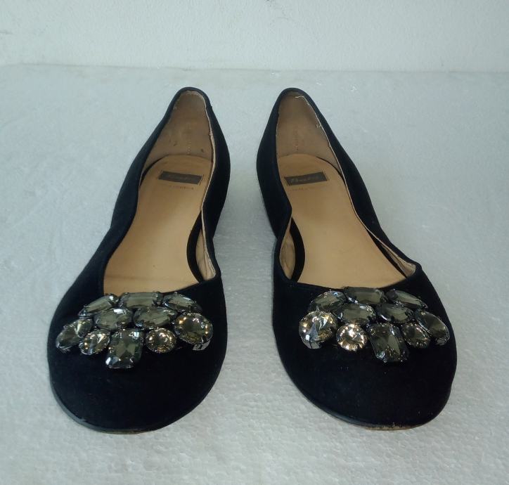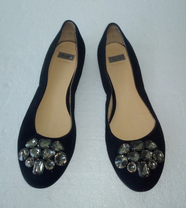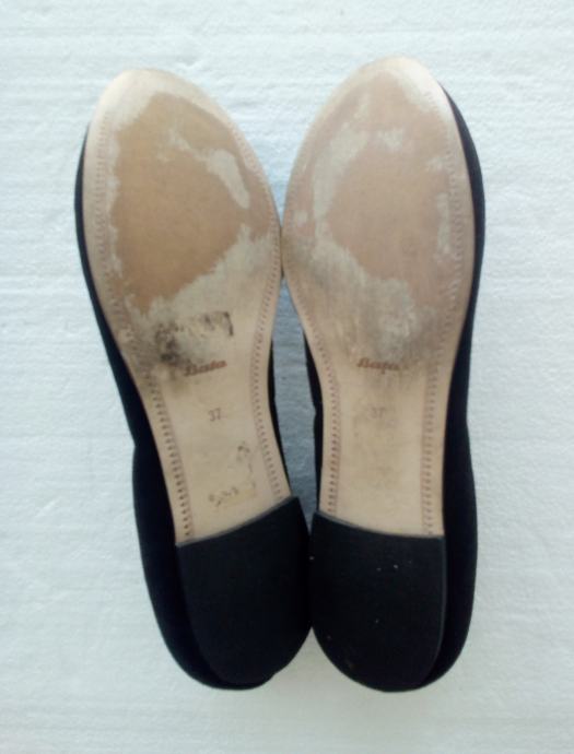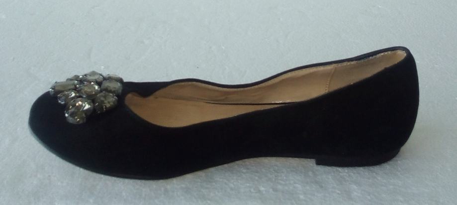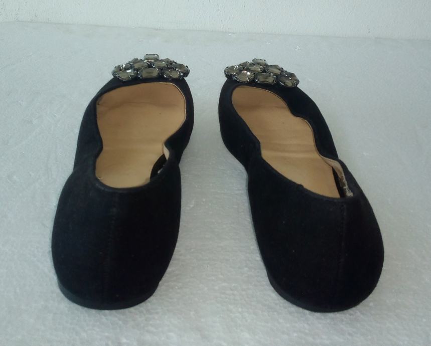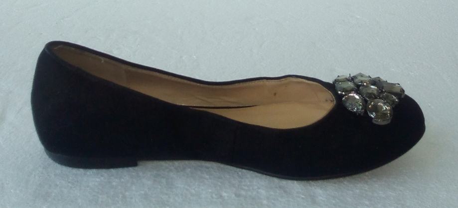 BATA crne balerinke sa deset ukrasnih 'dijamanata' na svakoj. Deklarirana veličina 37 (gazište 24,3 cm)., realno 36,5. Gornjište od prirodne velur kože, a iznutra imitacija glatke kože. Tabanica od prirodne kože. Petica pola cm. Nošene nekoliko puta i u ispravnom stanju.