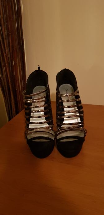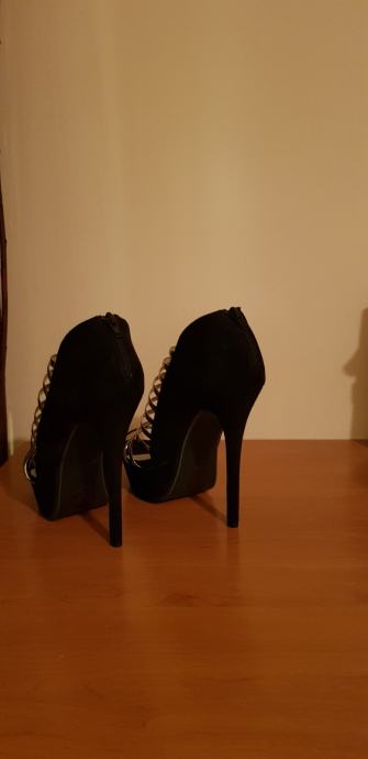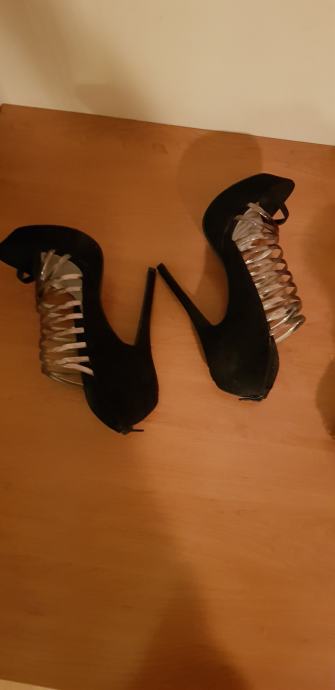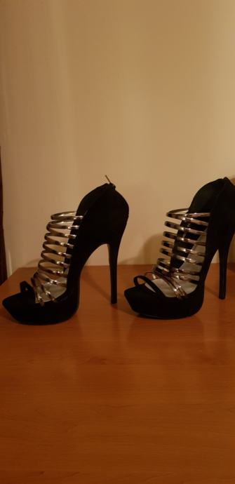 Crne cipele sa lakirnim srebrnim remencicima na visoku petu (15cm) broj 40 kupljene za 250kn u dolce ceciliji za photo shooting te poslije toga nikada nisu nosene.