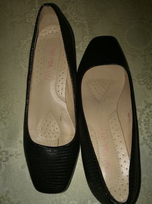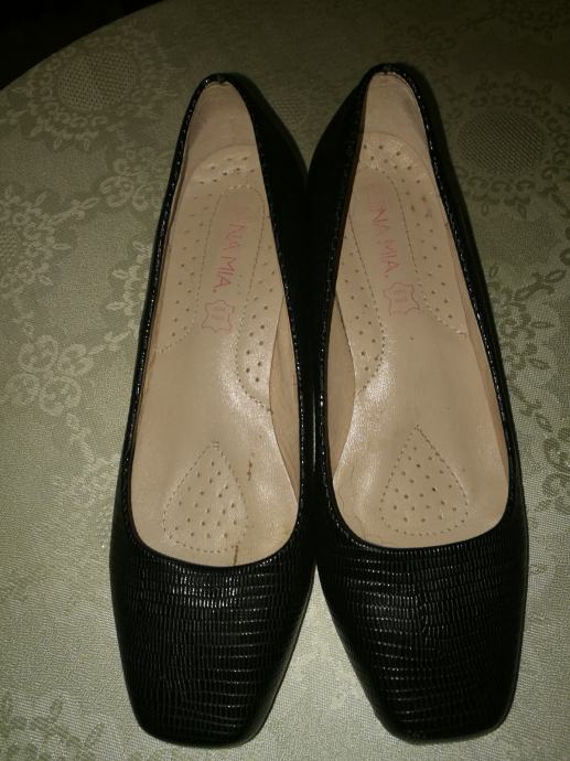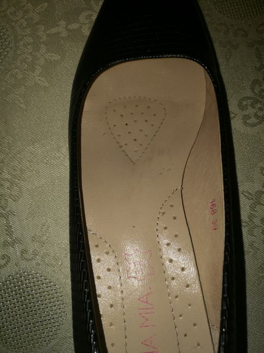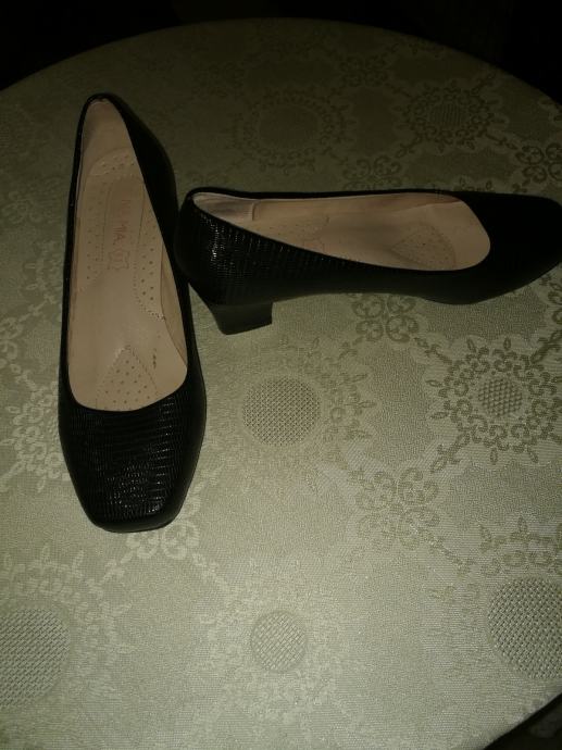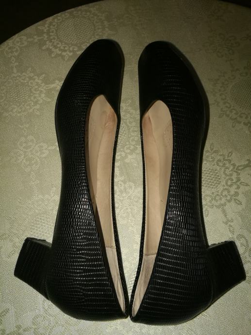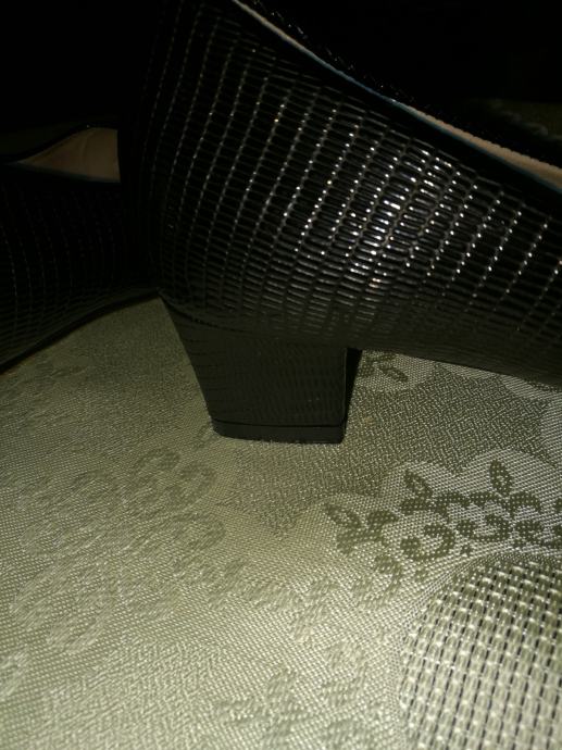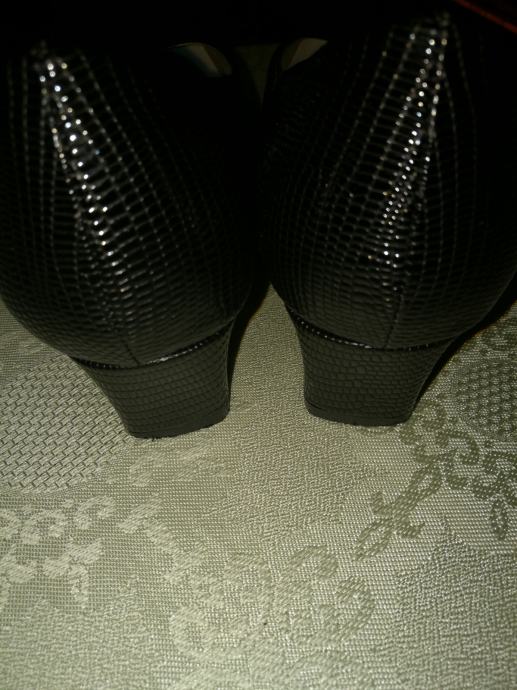 Crne, elegantne cipele, uzorka poput zmijske koze, broj 39.Potpetica od 4 cm za ugodno nošenje, kao i kozna unutrašnjost cipele. Dostava nije uključena u cijenu. Na području Zagreba dostava po dogovoru.