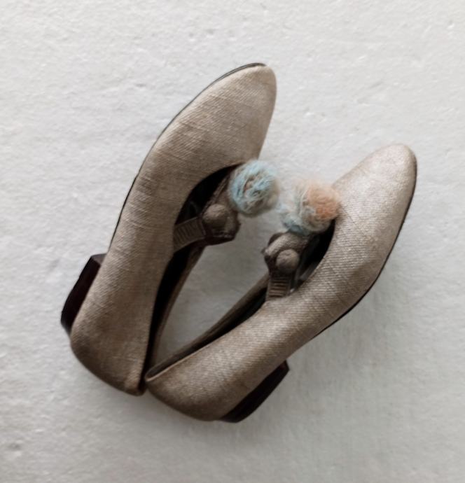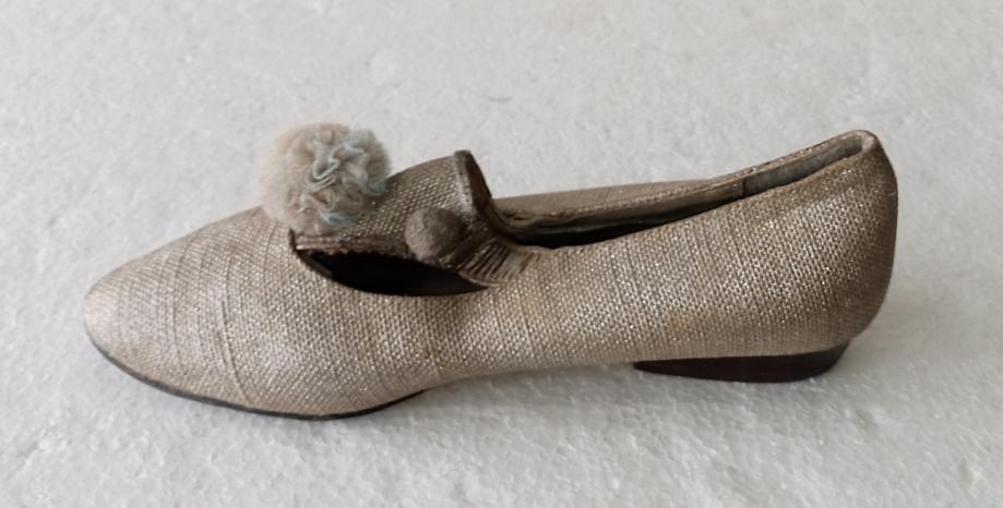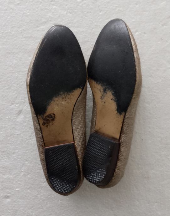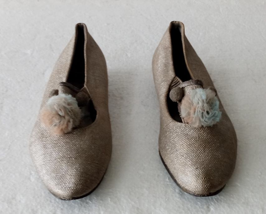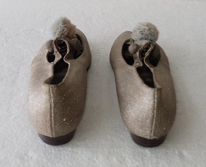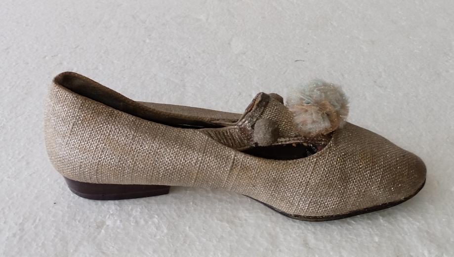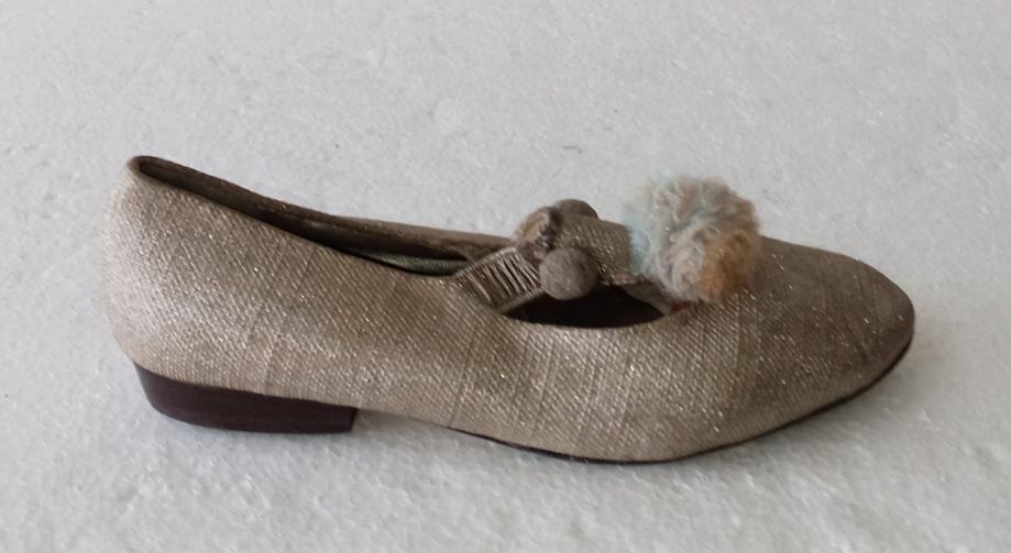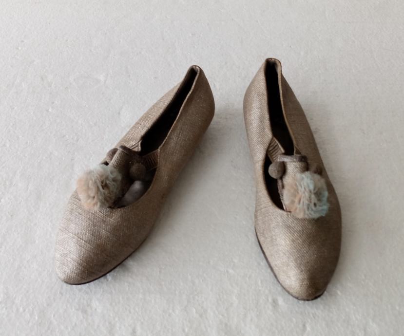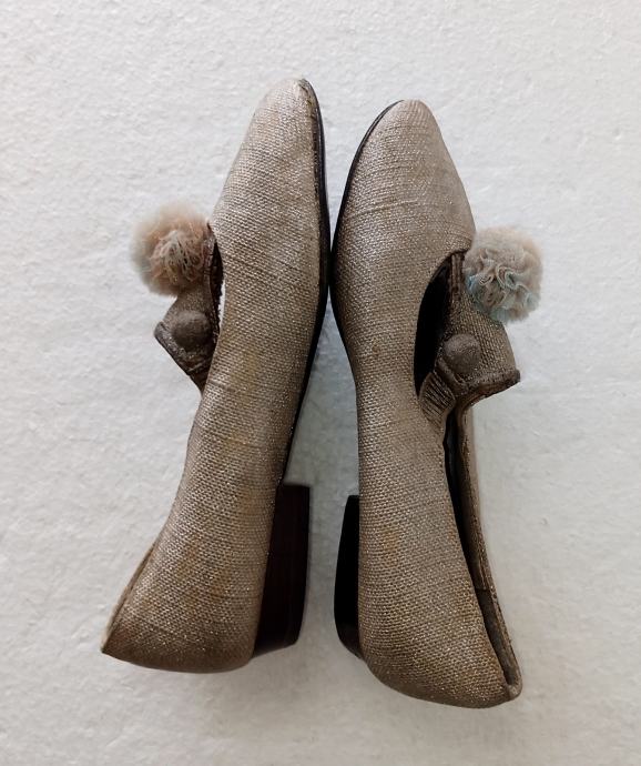 Vintage metalik zlatne cipelice veličine, deklarirane veličine 36. Imaju dva mala pompona od vatelina i jednim veći od čipkastog materijala sa prelijevajućim nijansama boja. Gornjište izrađeno od čvrstog kanavasa, iznutra od kože. Nošene, restaurirane i u odličnom stanju.