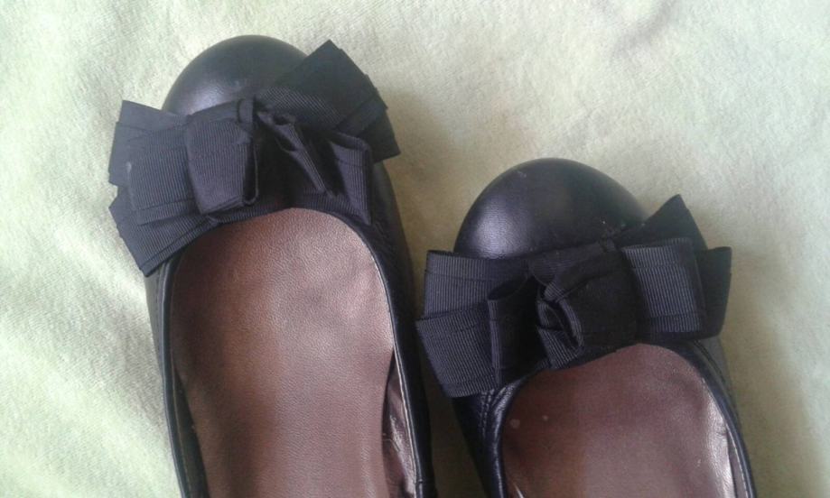 Crne zenske cipele sa mašnom, izgledaju kao baletanke, ali imaju nisku petu od cca 3 cm sto im daje eleganciju. Od prave su kože, kupljene u deichmana. Nisu nikada nosene, samo isprobane po kući. Kupovala sam ih rano ujutro i zeznula se za broj...