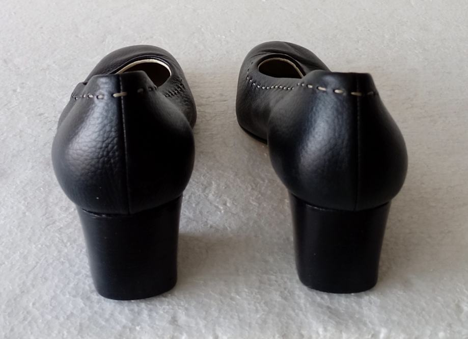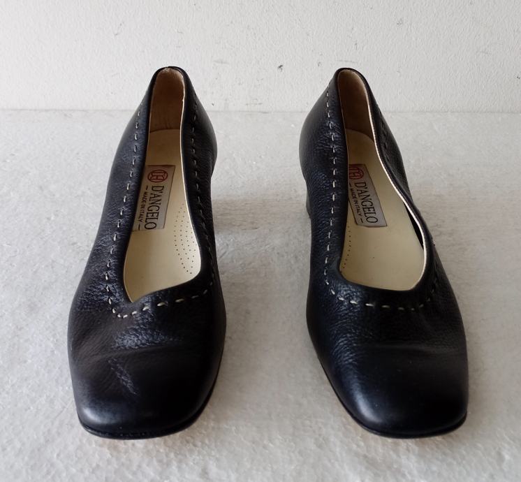 Visoko kvalitetne D'ANGELO crne cipele sa ukrasnim bijelim šavom. Deklarirana veličina je 40 (unutrašnje gazište 27 cm). Cijele od prirodne kože, što je vidljivo na piktogramu na potplatu. Gornjište ima zrnatu teksturu. Iznutra anatomski kožni uložak. Imaju blok petu visine 4,5 cm. Jednom obuvene, kao nove. Veličina nije odgovarala. Izuzetno mekane i udobne.