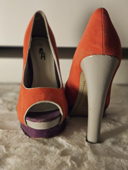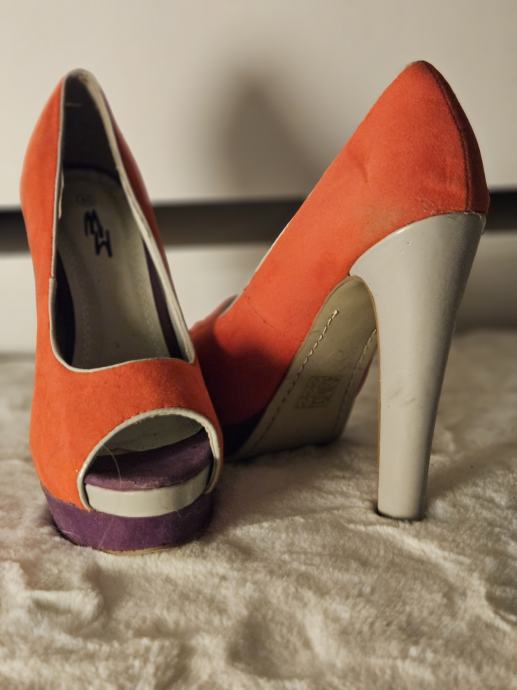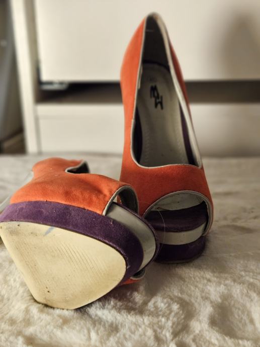 Prodajem elegantne narančaste salonke s otvorenim prstima, veličine 40. Cipele imaju visoku bijelu petu i ljubičasti detalj na platformi. Rabljene su ali još uvijek u dobrom stanju, idealne za posebne prilike.