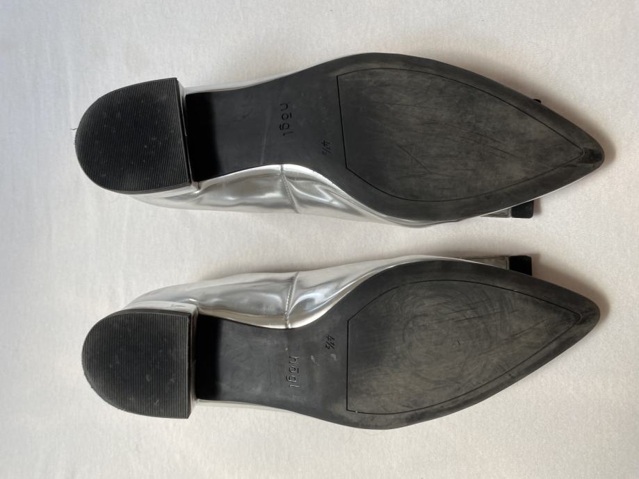 Atraktivne kozne cipele u srebrno boji sa istaknutom kopčom s crnim detaljima.
