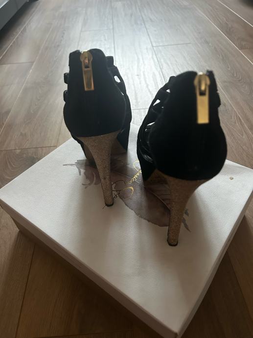 Kožne otmjene cipele na petu brenda Jessica Simpson. Cipele su od brušene kože crne boje dok su pete zlatne šljokaste.