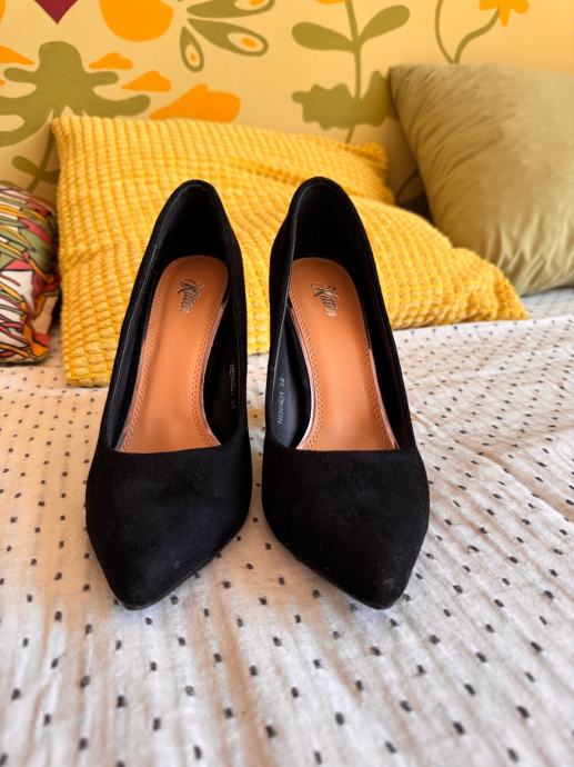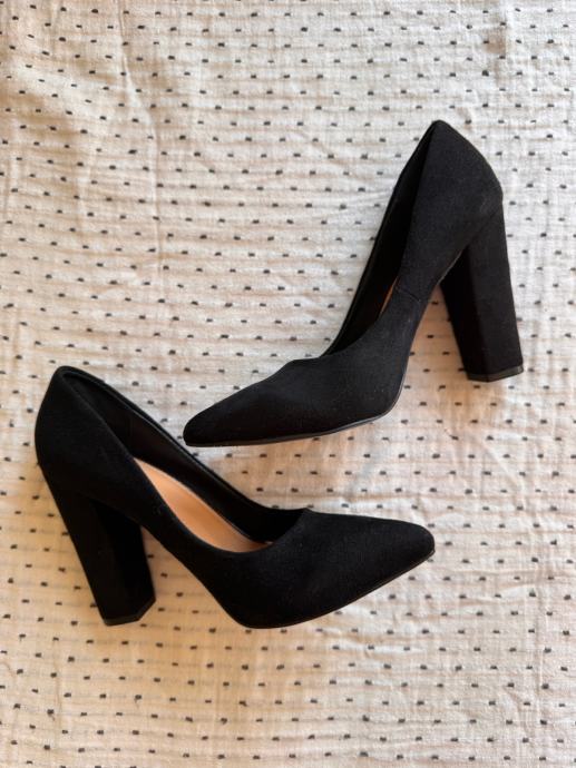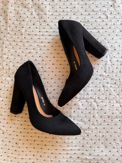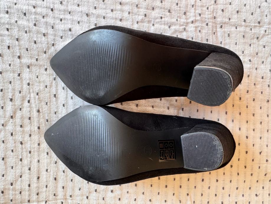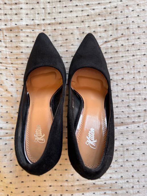 Prodajem crne Kitten štikle s debljom petom visine 10 cm, veličina 38. Vanjski dio je od brušene umjetne kože, podstava od kože od kombinacije kože i sintetike, crne boje.