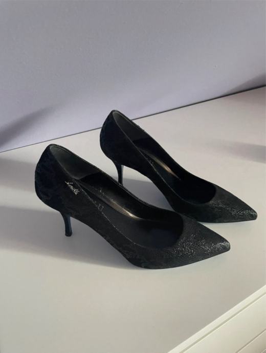 Crne boje s profinjenom teksturom, lagano se šljokicaju a plavi potplat daje twist. Špic vrh i elegantna potpetica – savršene za večernje prilike, blagdane, poslovne evente ili svečane kombinacije.