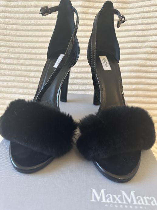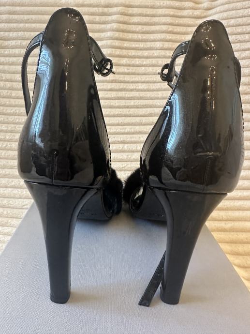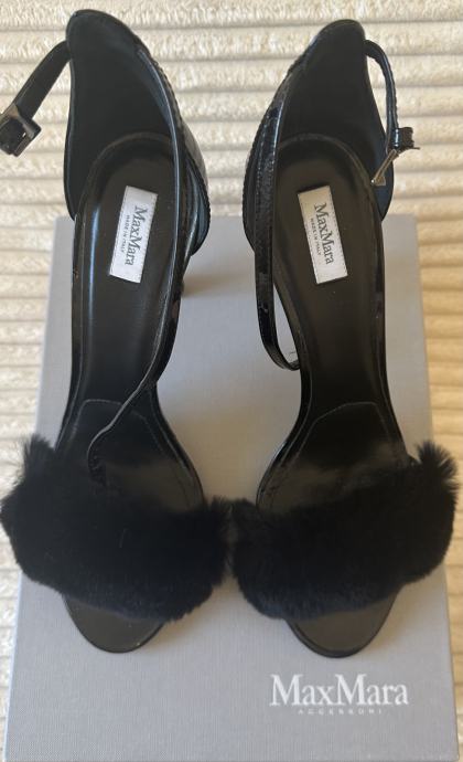 Max Mara Crne lakirane kožne sandale s krznom, peta 10 cm. Dno je završeno zaštitom od klizanja. nošena samo jednom, odlično stanje