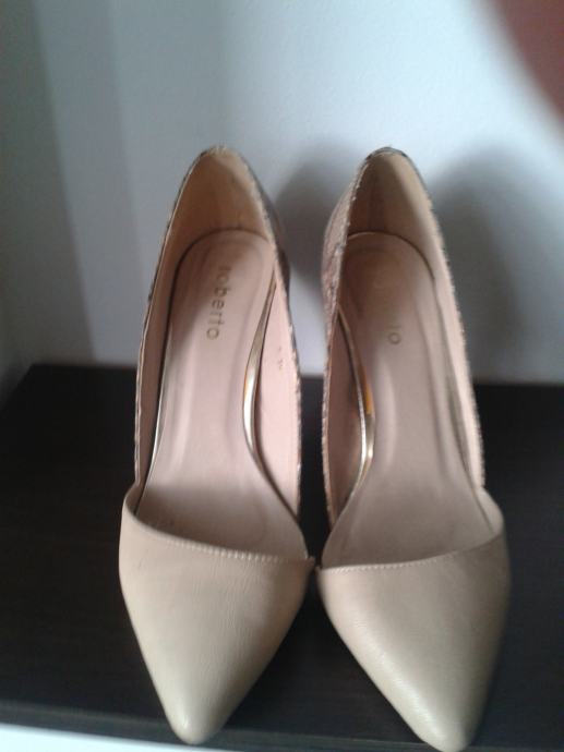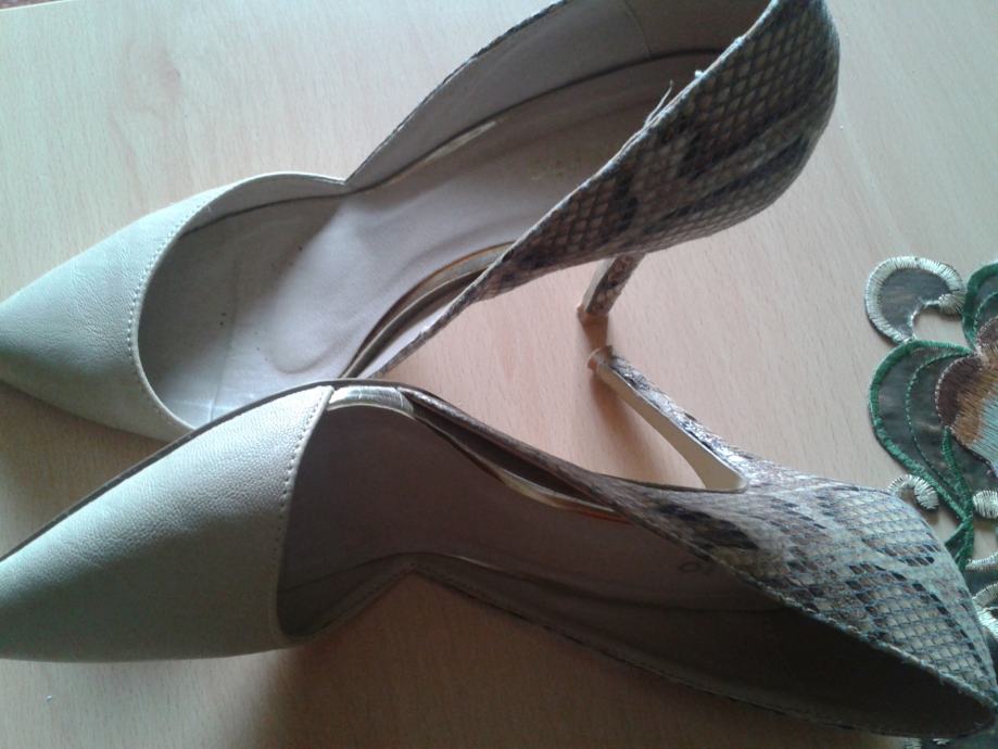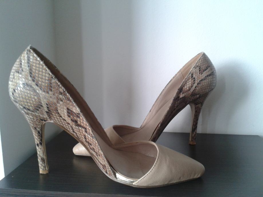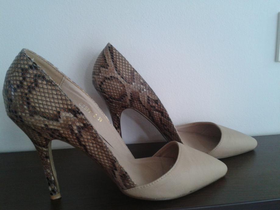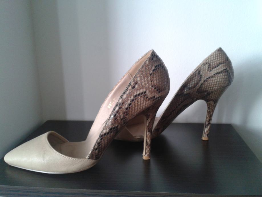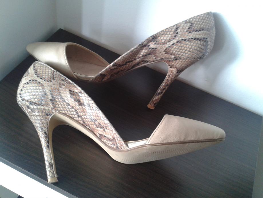 Bež boje, u odličnoj kombinaciji sa zmijskim uzorkom...za svaku priliku.Nošene jednom prilikom, ali kao nove,meni nažalost male.
