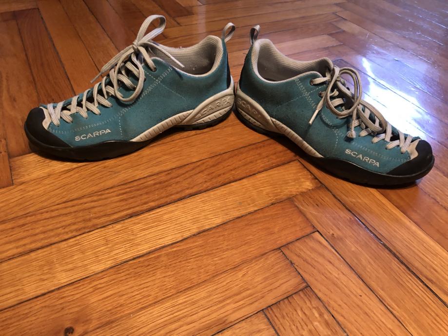 Ženske, sportske cipele, SCARPA, broj 39, nošene jednu godinu, kožnate, tirkizna boja, iznimno udobne, za slobodno vrijeme i manje zahtjevne ture na planini. Vibram đon.