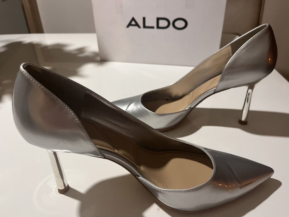 Prodajem srebrne štikle marke Aldo, veličina 39. Radi se o klasičnim salonkama s istaknutim šiljastim vrhom i otvorenom stranom (d'Orsay dizajn). Peta je visoka 8 cm, tanke je forme i srebrne boje koja prati ostatak cipele. Materijal ima lijepi srebrni sjaj. Blago oštećenje na peti.