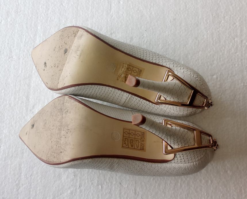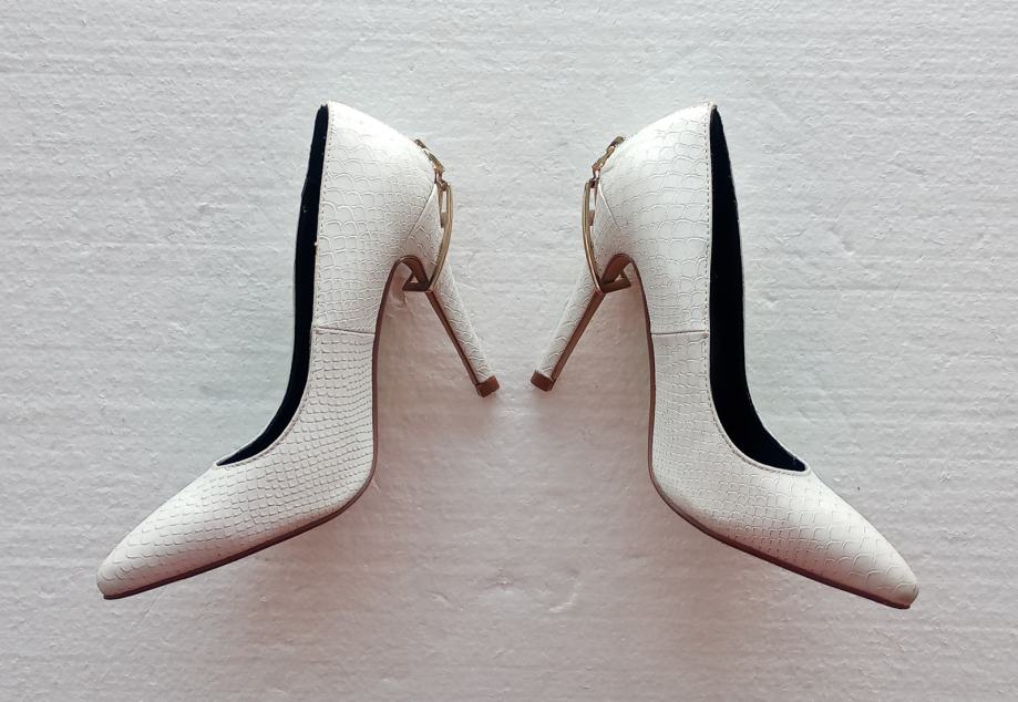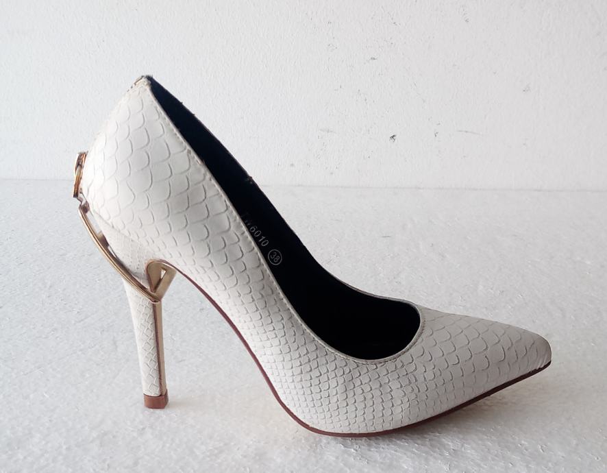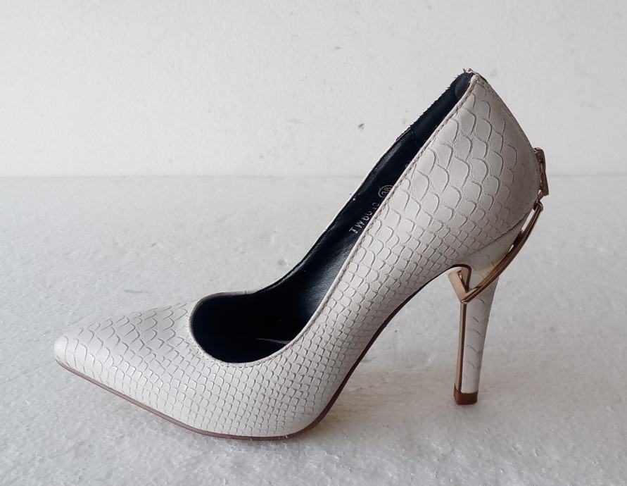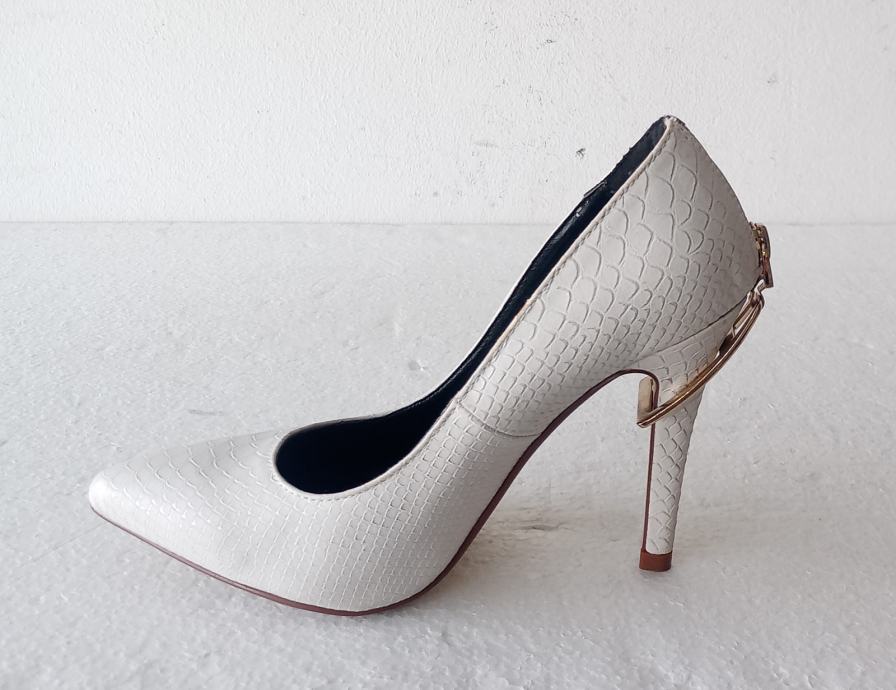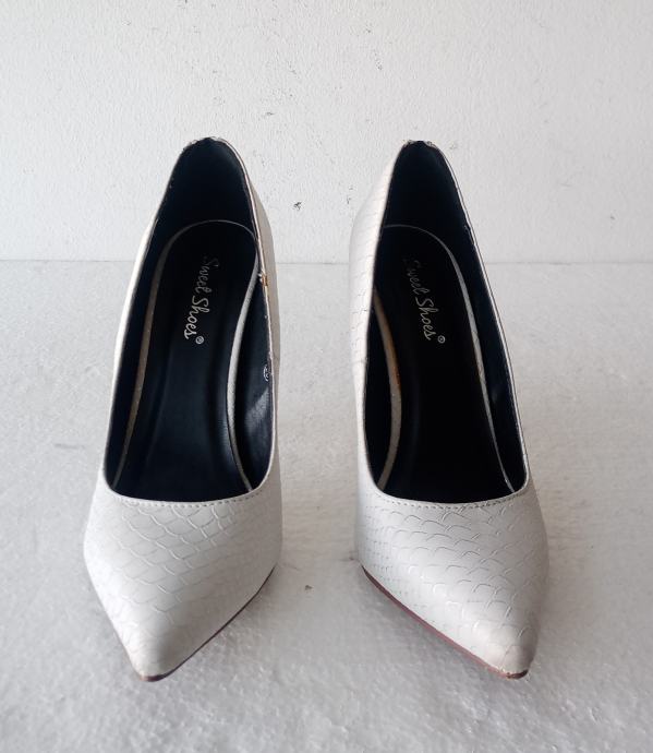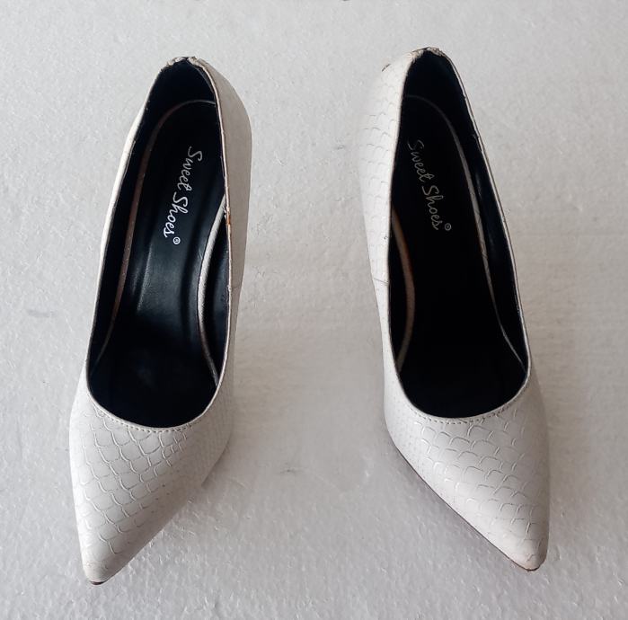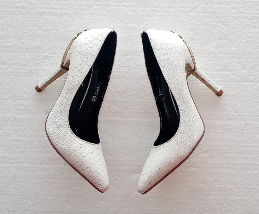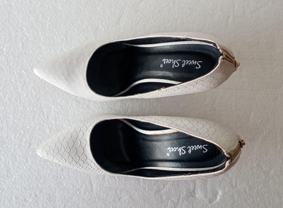 Sweet Shoes elegantne bijele špic salonke sa zlatnim ukrasom i zatvaračem iznad pete. Deklarirana veličina 38 (unutrašnje gazište 24,5 cm), realno su vel. 37. Izrađene od imitacije kože u kroko dezenu. Visina pete je 11 cm. Nošene jednom prigodom, u odličnom su stanju (na fotki lijeve s unutrašnje strane izgleda ko da je crna točkica dole, ali na fotki obje polegnute - vidi se da su čiste).