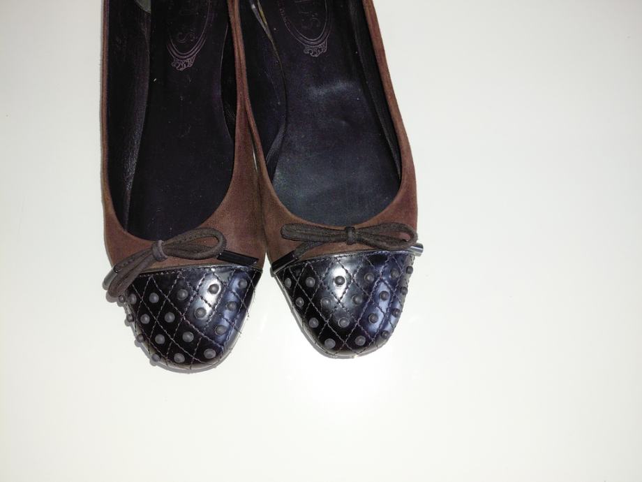 Tod`s balerinke u kombinaciji crnog laka i tamnosmeđe brušene kože.