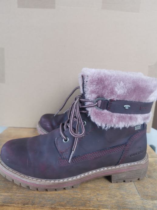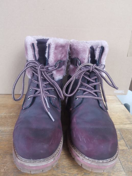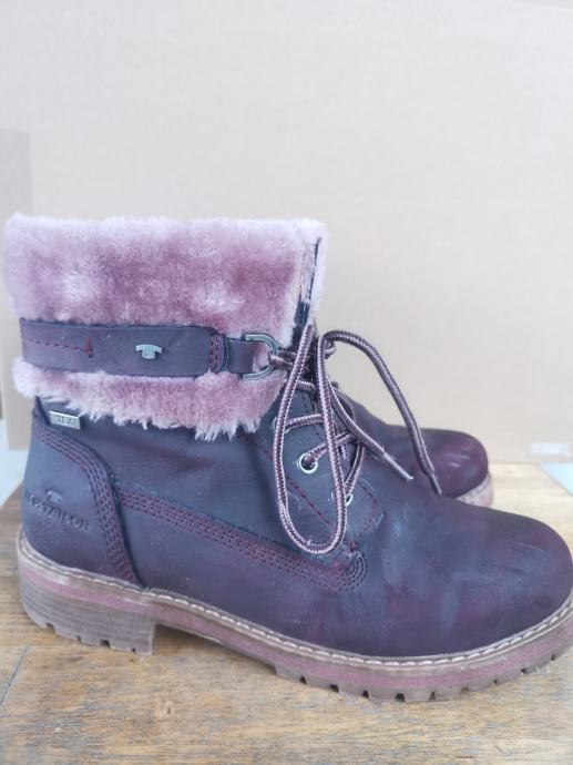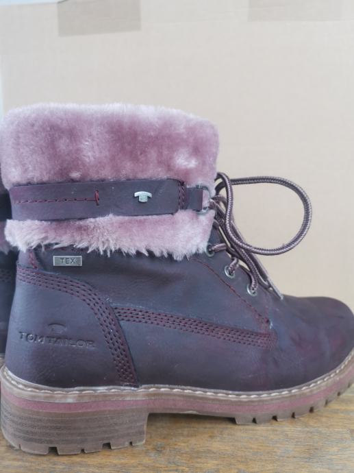 Tamnoljubicaste gleznjace Tom Tailor sa ruzicastim krznom, podstavljene i mekane iznutra. Nosene svega nekoliko puta i prerastene. Materijal je umjetna koza zato su na fotki vidljivi plitke ogrebotine, no uopce ne smeta za buduce nosenje ni kada se namazu kremom za cipele. Komotan br. 38
