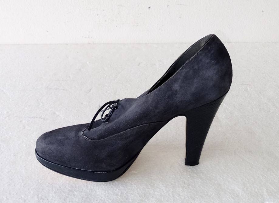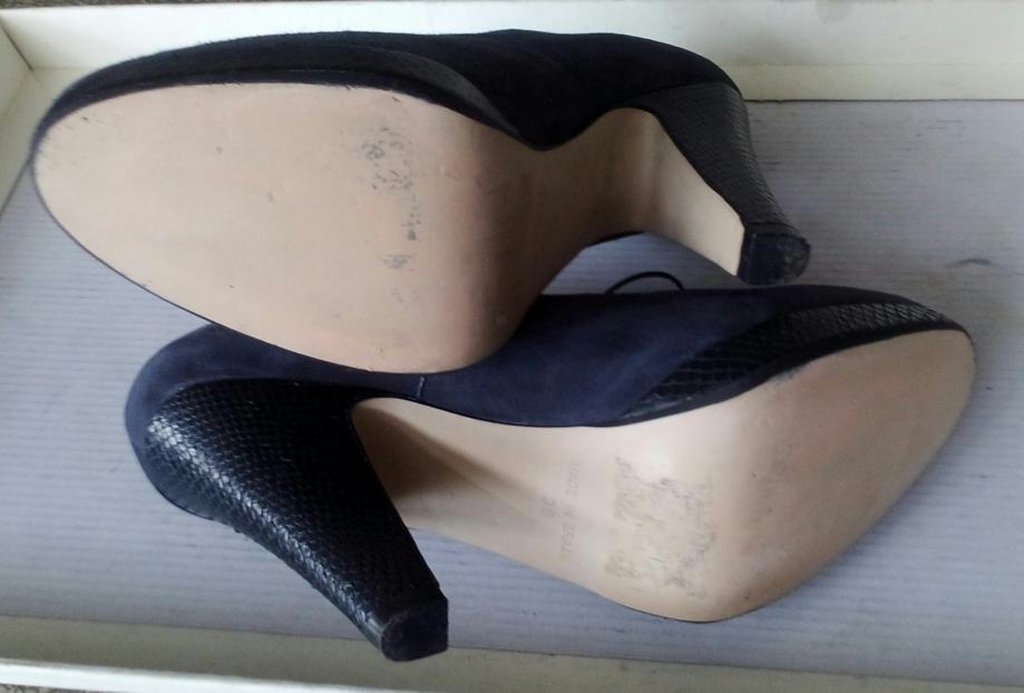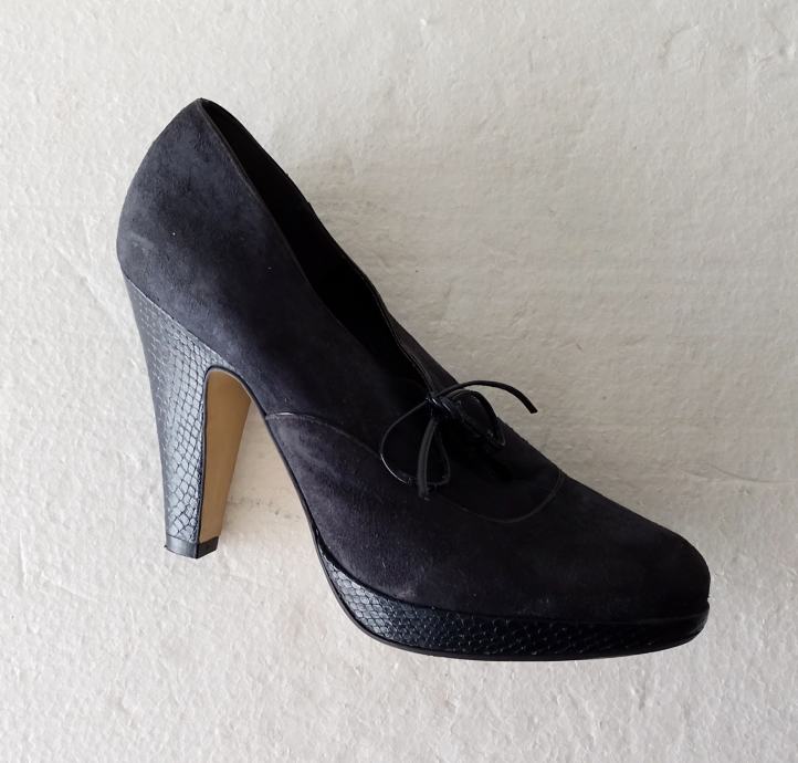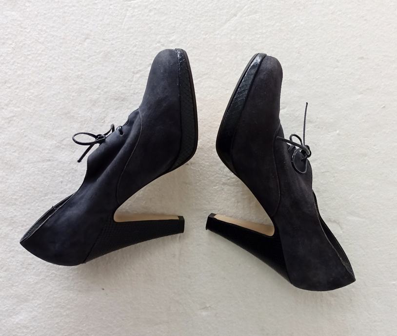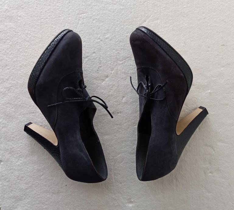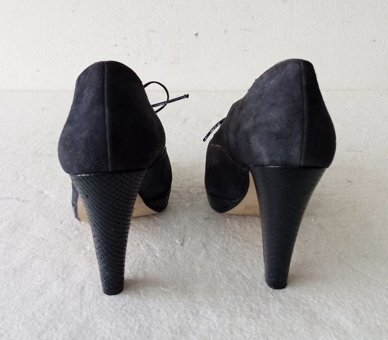 Elegantne Topshop cipele (made in Brazil), deklarirane veličine 39, ali su realno 38). Gornjište izrađeno od prirodne velur kože sive boje, sa crnim kožnim lak vezicama. Iznutra duod glatke kože, sa džonovima i petom od prave zmijske kože sa ljuskicama. Peta je visine 11 cm, a džonovi 2 cm. Obuvene doslovno jedan put.